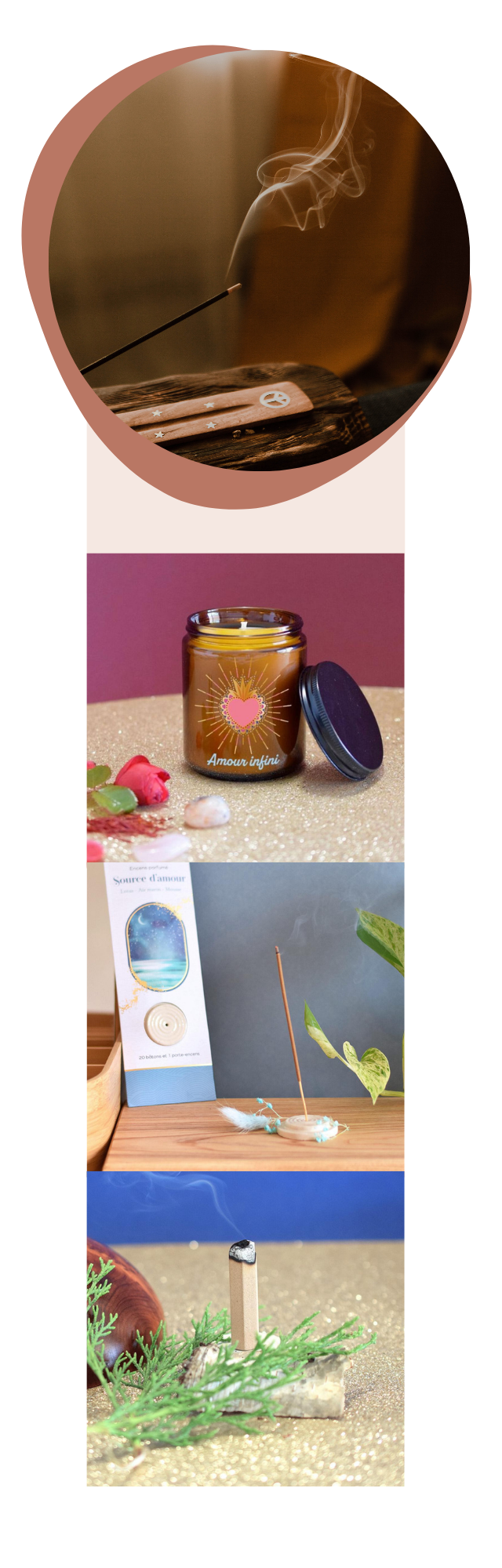 - Encens en bâtons ou cônes : parfaits pour purifier l’espace et marquer un rituel.