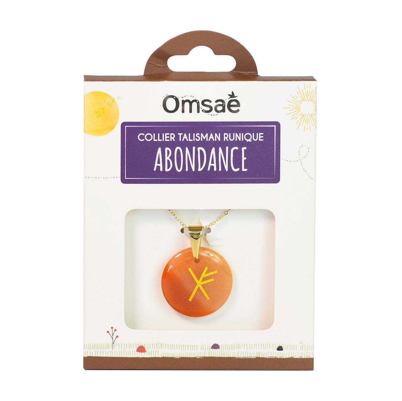 Collier composé d'un pendentif en pierre naturelle de pierre de soleil gravé de la rune liée Abondance et d'une chaîne en acier inoxydable. La combinaison des runes nordiques ancestrales Gebo (don) et Fehu (prosperité) représente la rune liée don d'Abondance. La pierre de soleil, pierre de vitalité et de confiance en soi, permet de renforcer les effets de ce talisman à porter sur soi pour bénéficier de ses vertus.