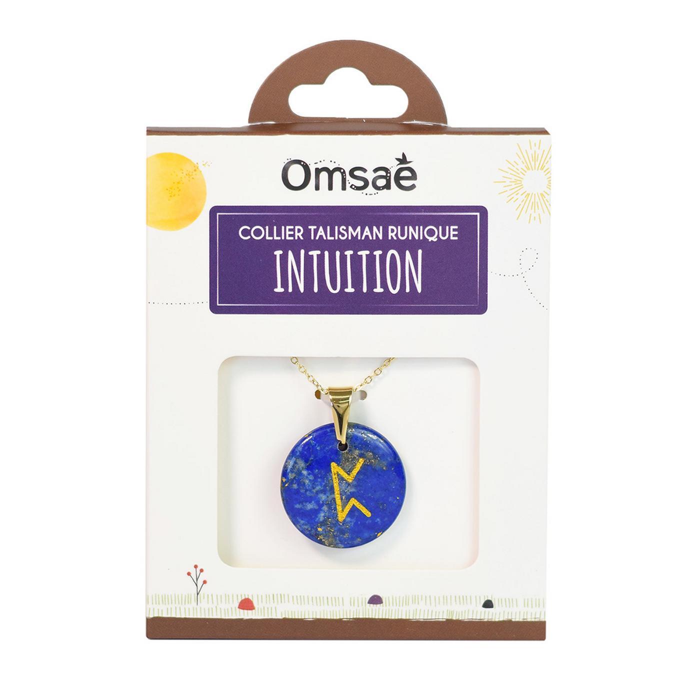 Collier composé d'un pendentif en pierre naturelle de lapis-lazuli gravé de la rune liée Intuition et d'une chaine en acier inoxydable. La combinaison des runes nordiques ancestrales Perthro (destin) et Laguz (force vitale), représente la rune liée Don d'Intuition. Le lapis-lazuli, pierre de sagesse, favorise l'ouverture d'esprit et permet de renforcer les effets de ce talisman à porter sur soi pour bénéficier de ses vertus.