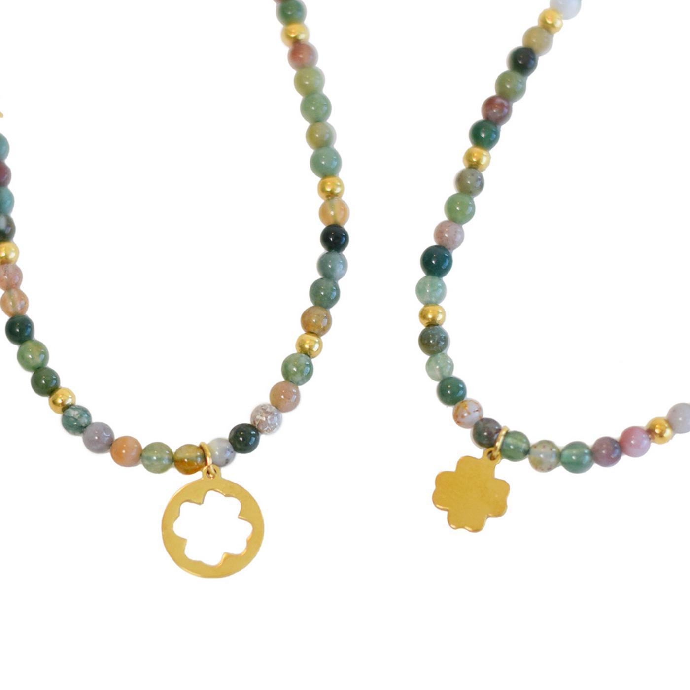 Bracelet constitué de perles en pierre naturelle et de perles en acier inoxydable doré de 3 mm, montées sur un lien ajustable grâce à un nœud coulissant. Bracelet agrémenté de charms en acier inoxydable doré. Longueur réglable de 16 cm à 27,5 cm. Pierres naturelles d'agate indienne (origine origine Inde).