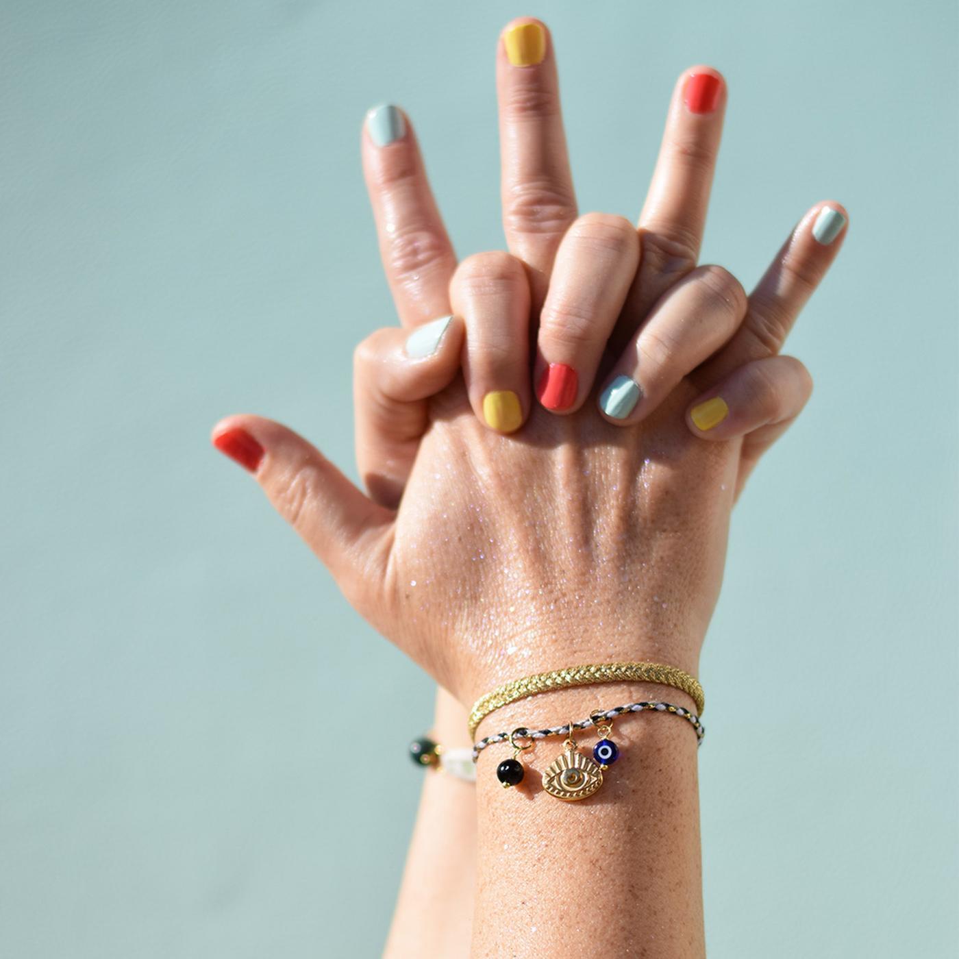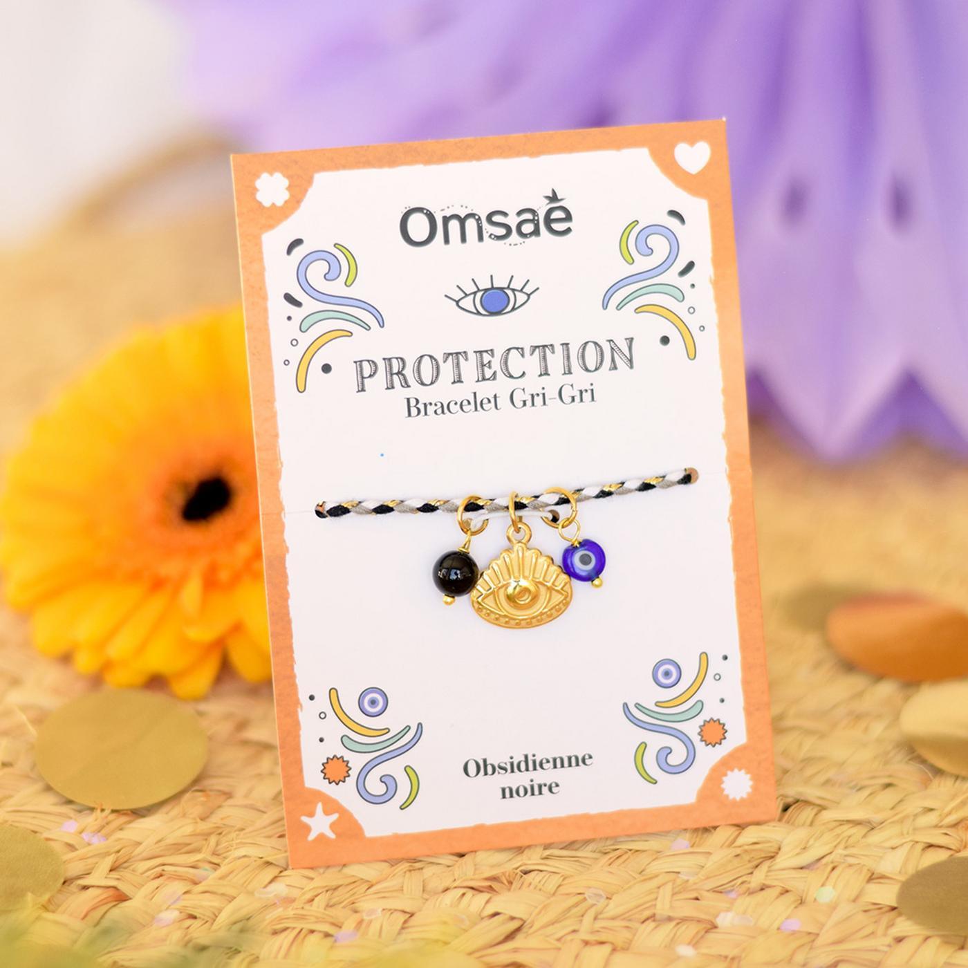 Véritable concentré de bonnes énergies, ce bracelet gri-gri est un cocktail coloré de symboles porte-bonheur. Conçu pour vous accompagner au quotidien, il vous apportera protection et énergies positives. Emblème de bouclier contre les énergies négatives, son œil protecteur se marie parfaitement avec les vibrations de l’obsidienne noire, favorisant la paix intérieure.