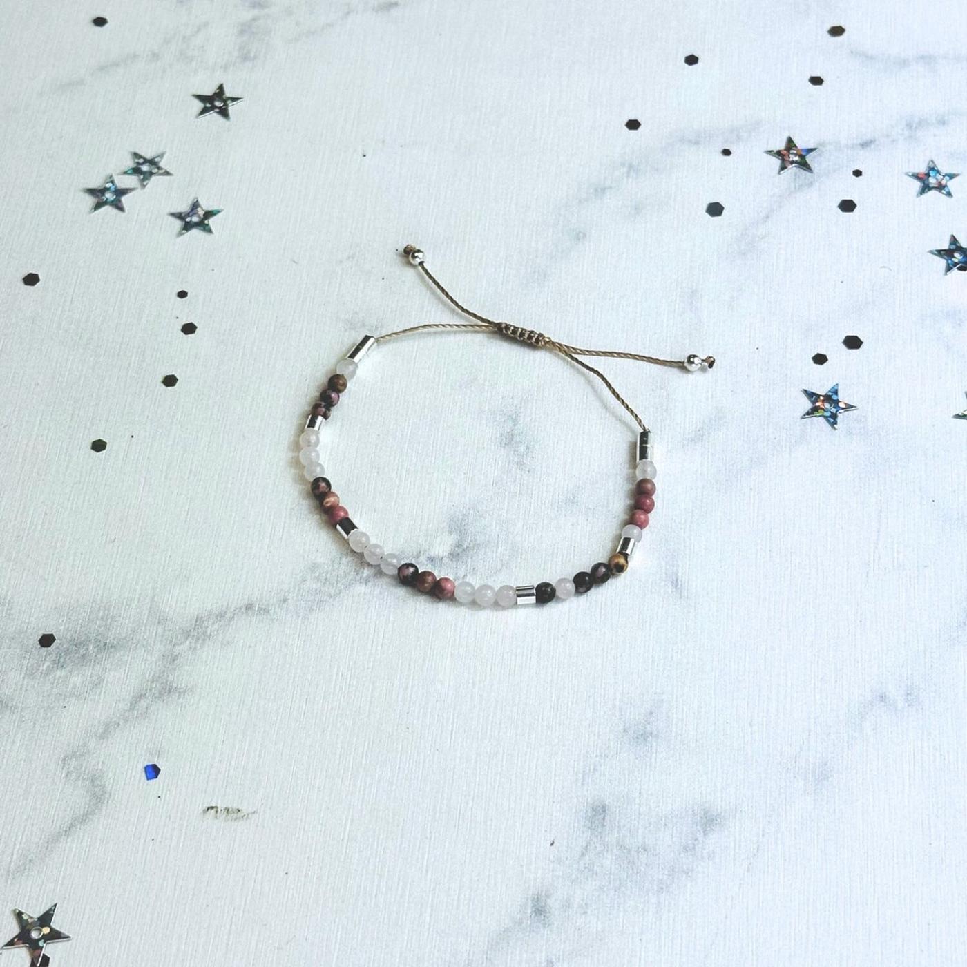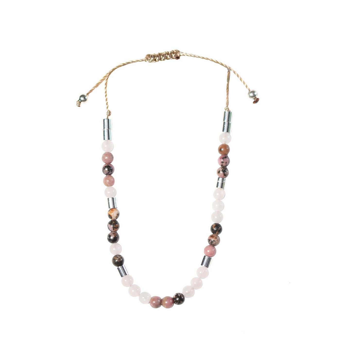 Bracelet à message Amour. Pierres naturelles de quartz rose origine Brésil et rhodonite origine Chine. Séparateurs en acier inoxydable. Cordon en nylon. Taille ajustable.