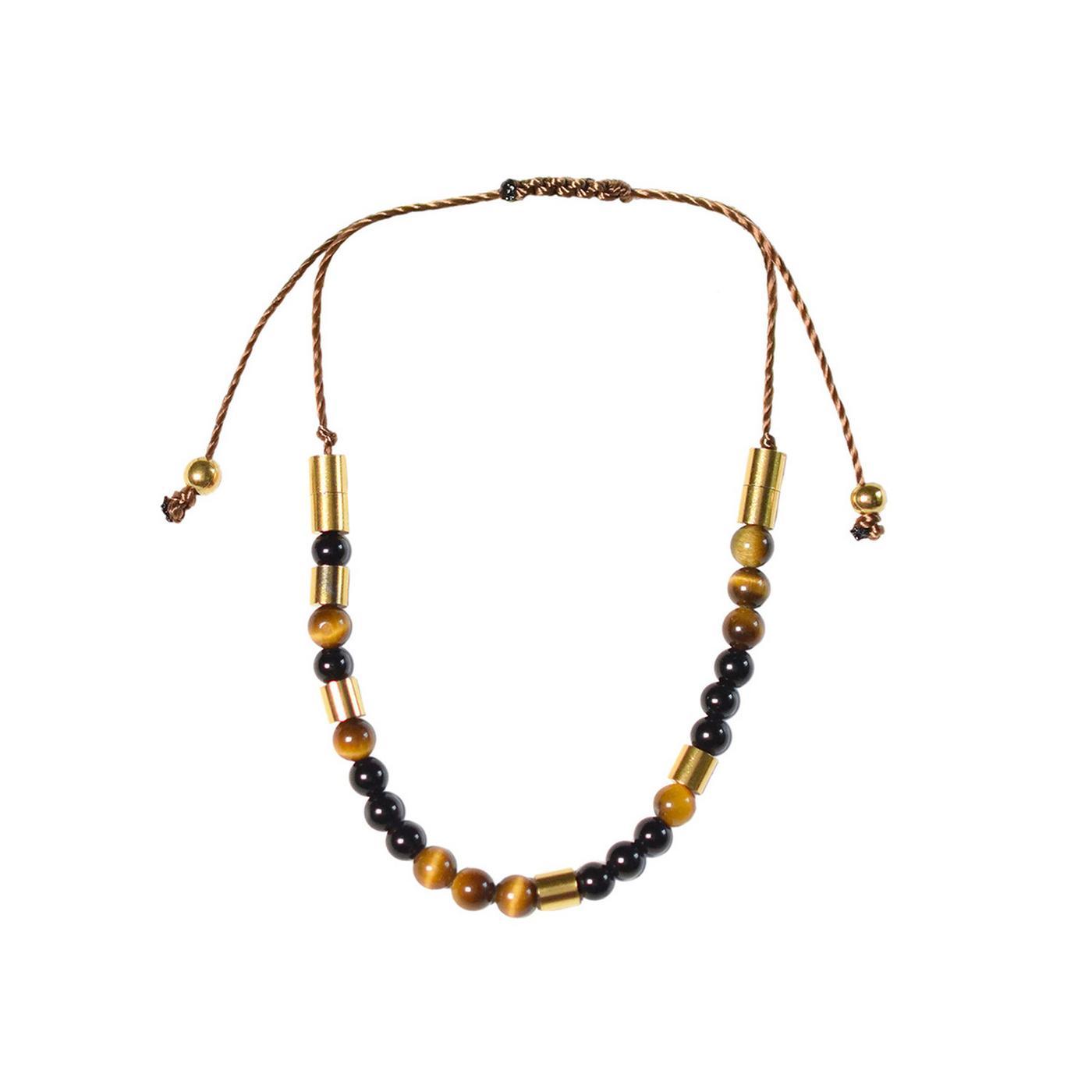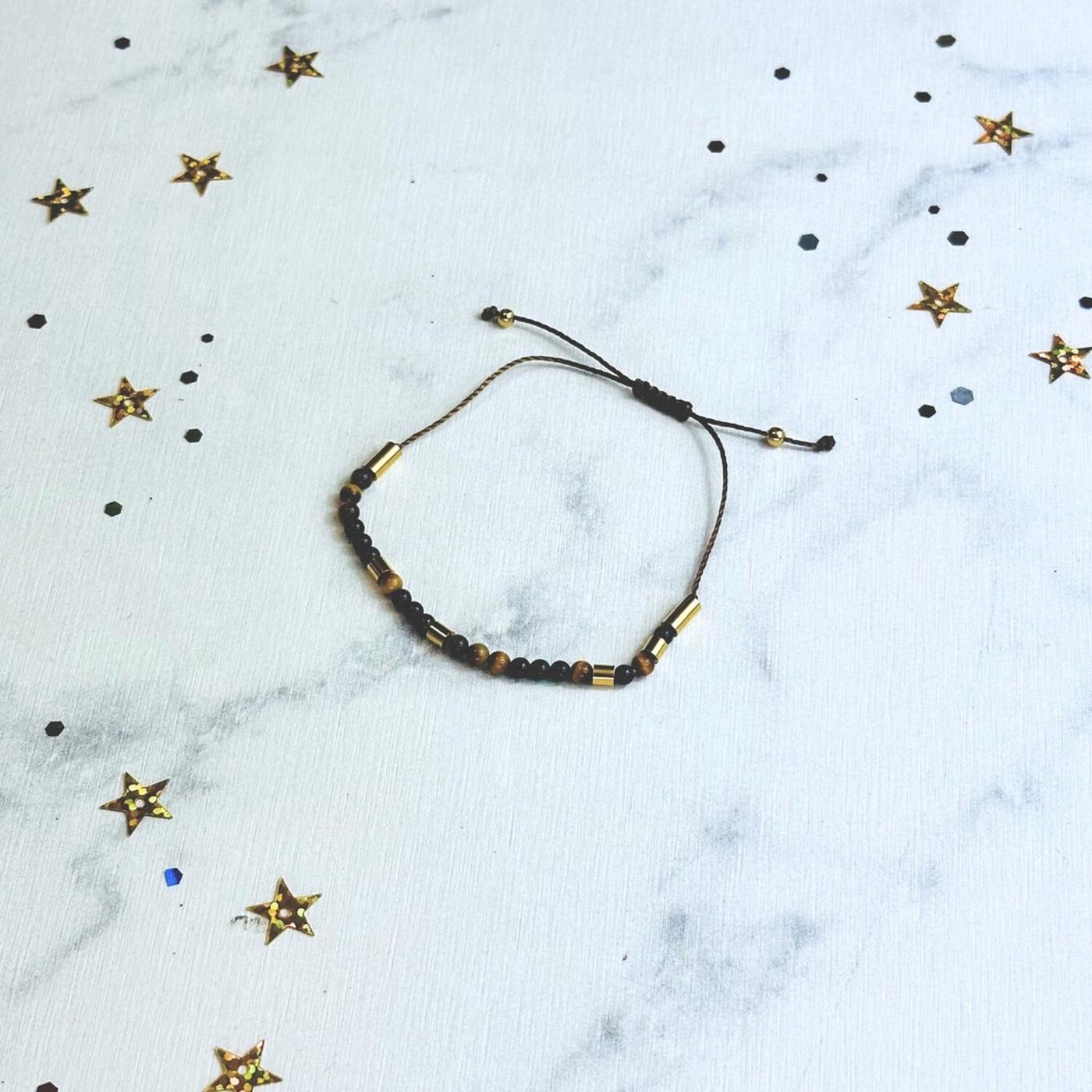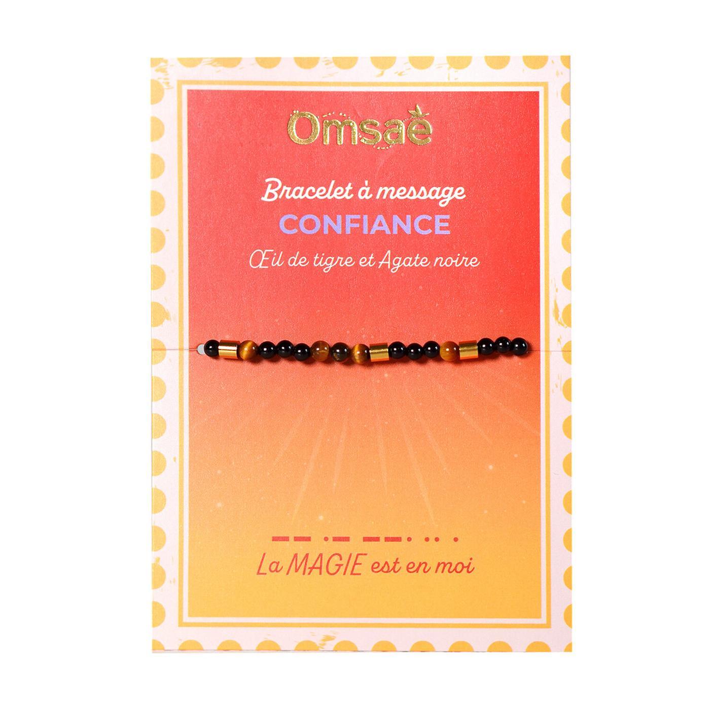Bracelet à message Confiance. Pierres naturelles d'œil de tigre origine Afrique du Sud et agate noire origine Brésil. Séparateurs en acier inoxydable. Cordon en nylon. Taille ajustable.