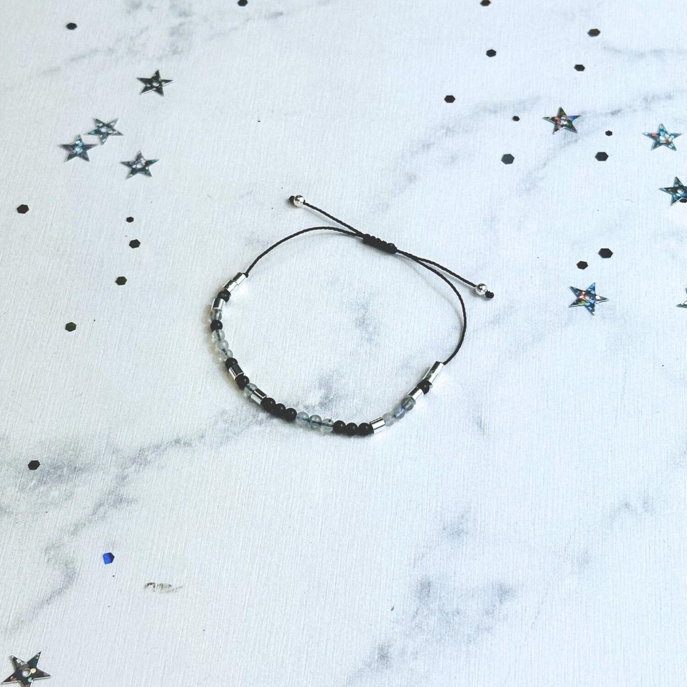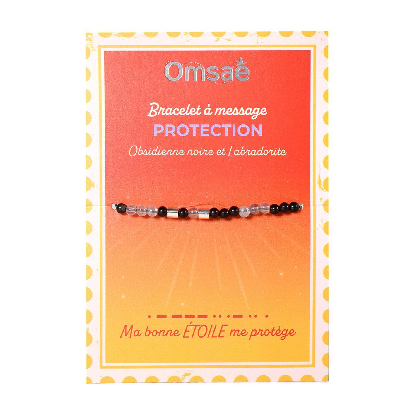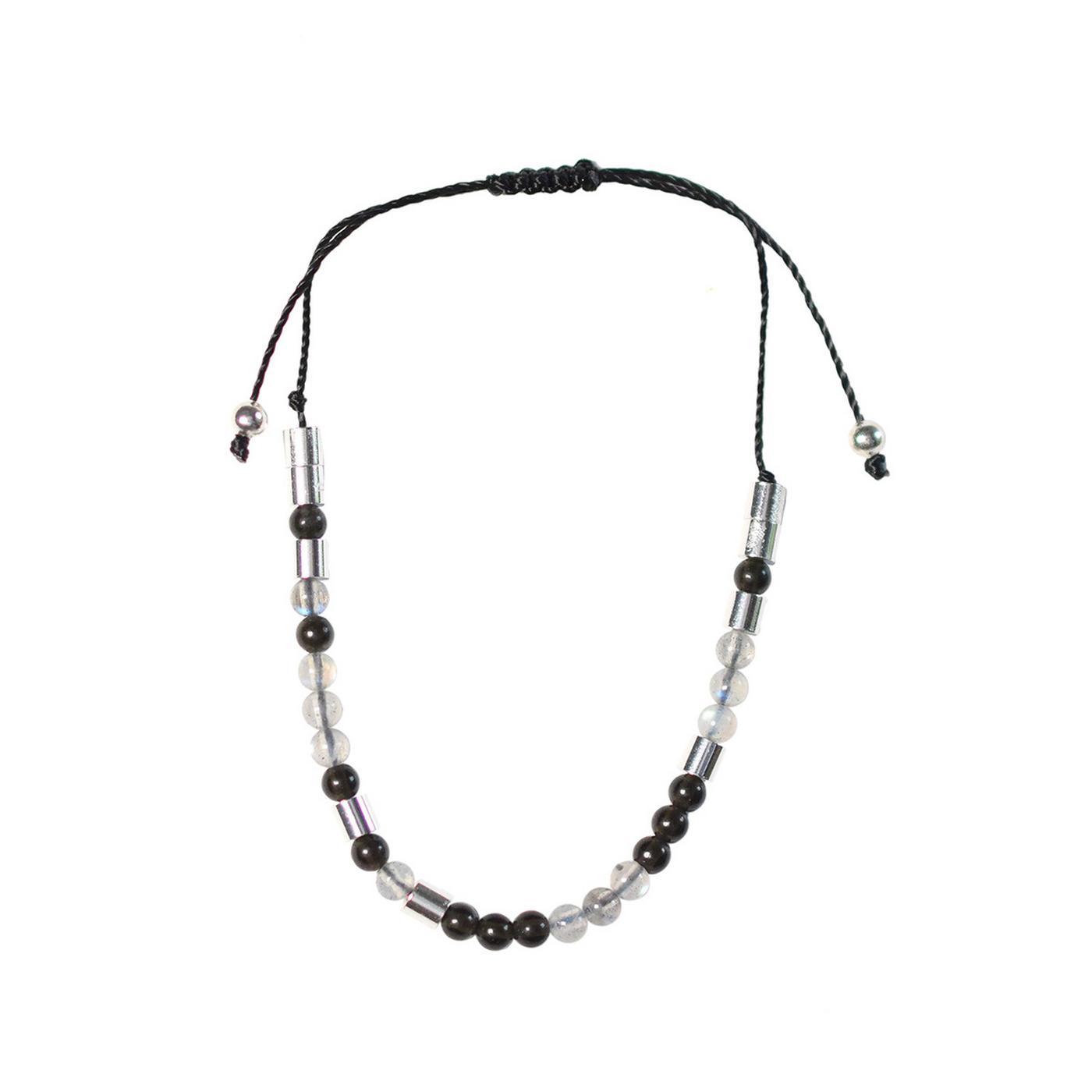 Bracelet à message Protection. Pierres naturelles d'obsidienne noire origine Chine et labradorite origine Madagascar. Séparateurs en acier inoxydable. Cordon en nylon. Taille ajustable.