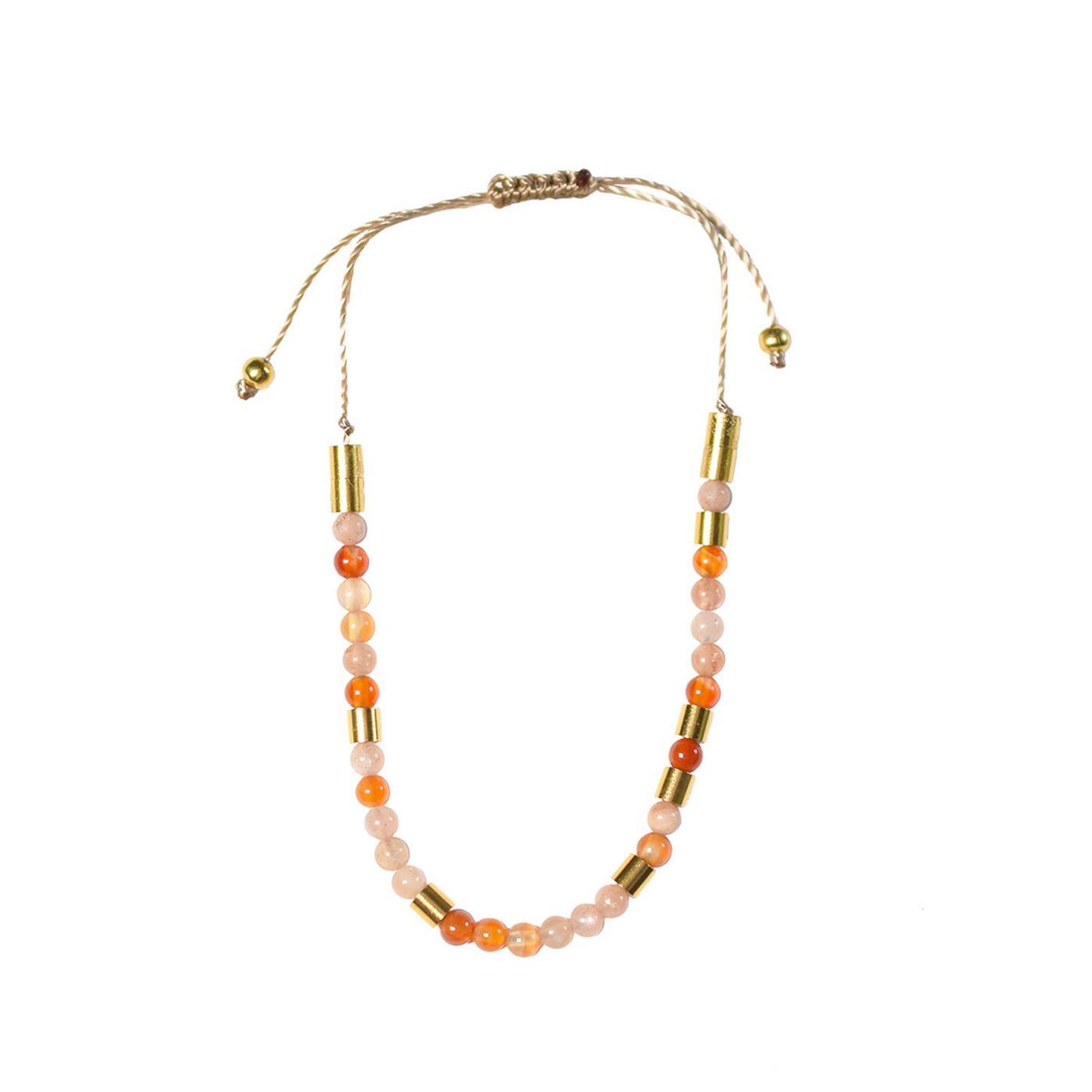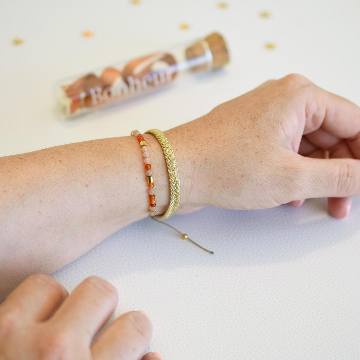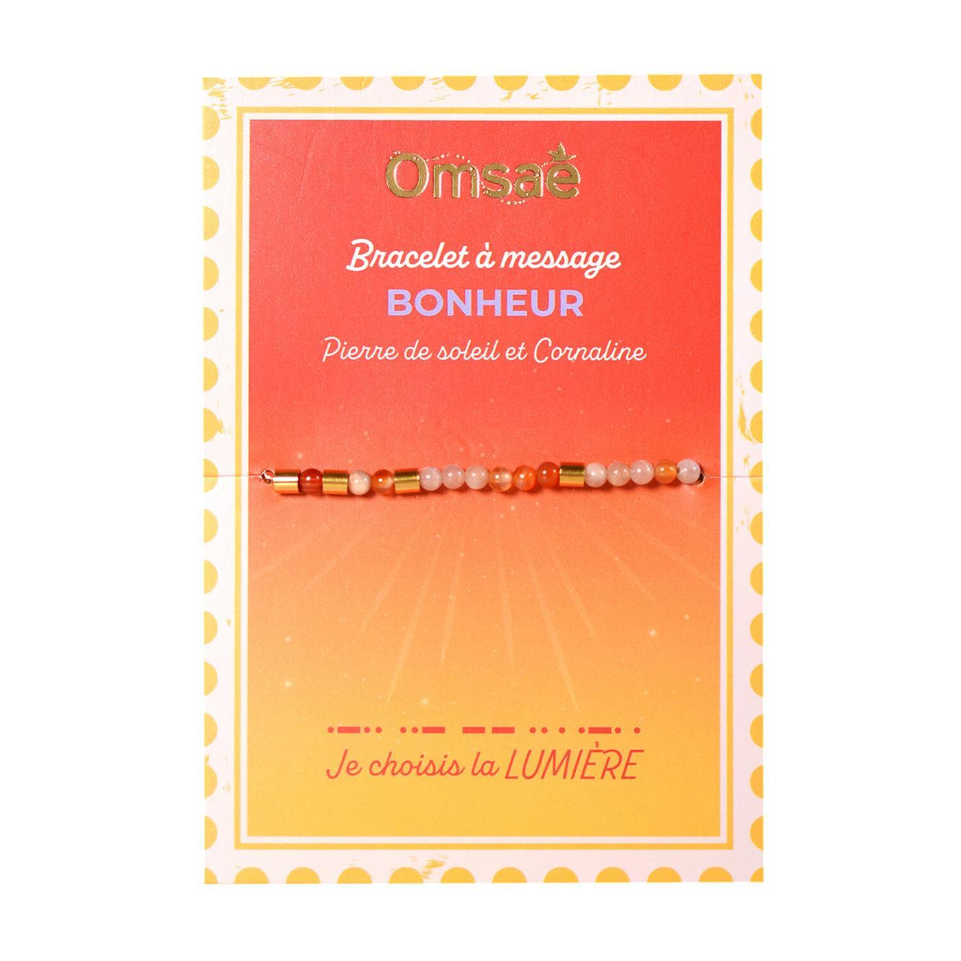 Bracelet à message Bonheur. Pierres naturelles de pierre de soleil origine Brésil et cornaline origine Brésil. Séparateurs en acier inoxydable. Cordon en nylon. Taille ajustable.