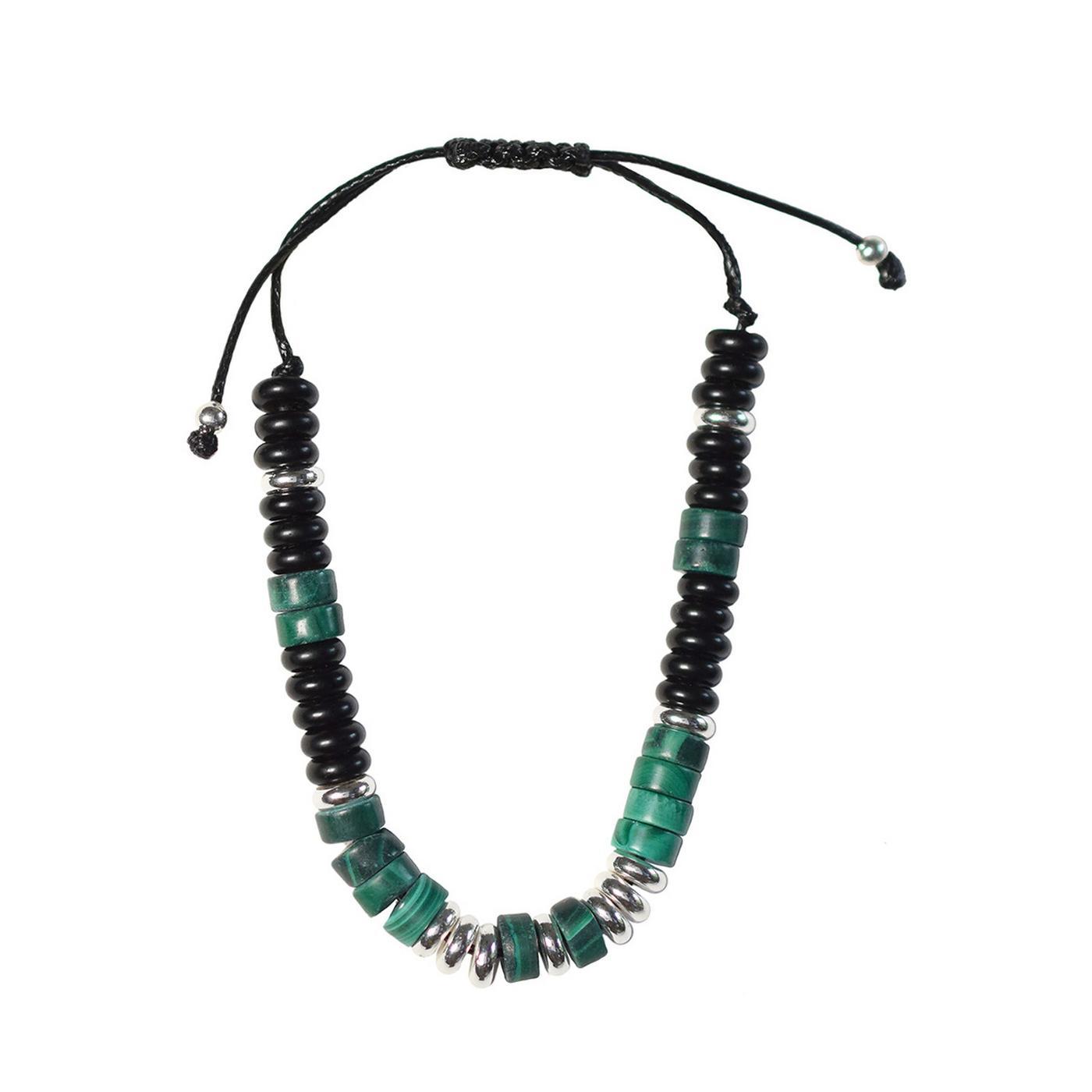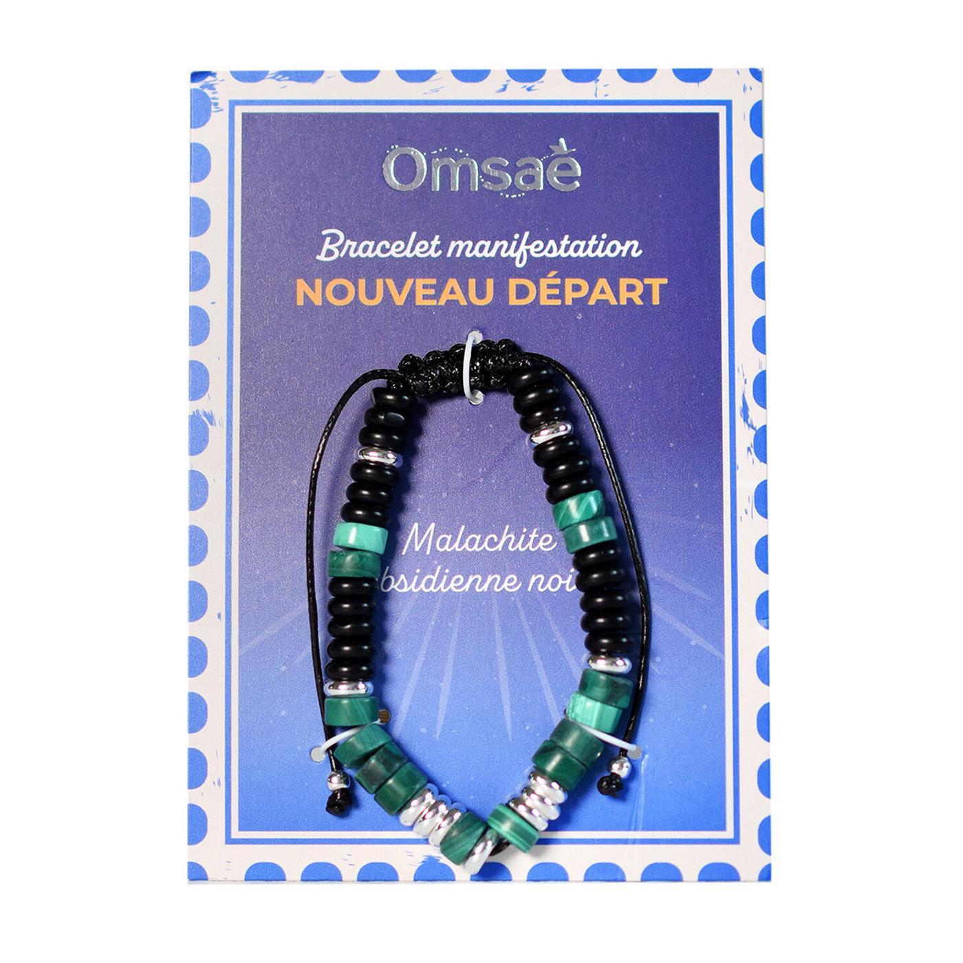 Bracelet manifestation Nouveau départ. Pierres naturelles de malachite origine Congo et obsidienne noire origine Chine. Séparateurs en acier inoxydable. Cordon en nylon. Taille ajustable.