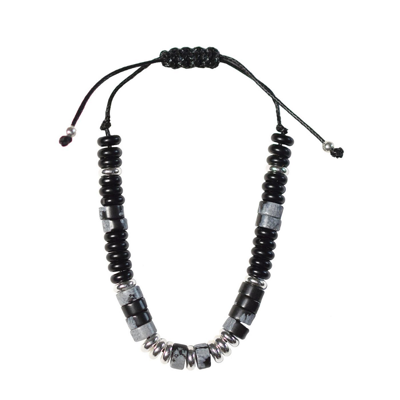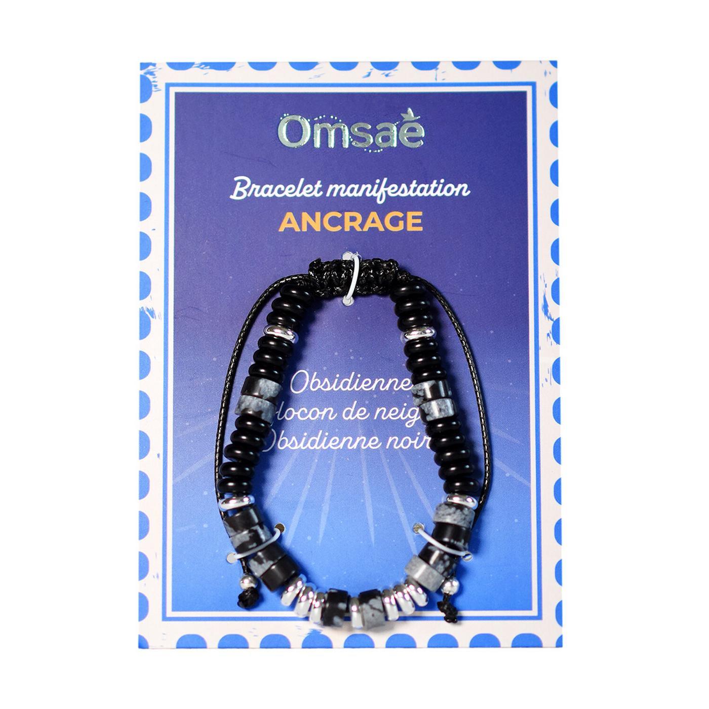 Bracelet manifestation Ancrage. Pierres naturelles d'obsidienne flocon de neige origine Afrique du Sud et obsidienne noire origine Chine. Séparateurs en acier inoxydable. Cordon en nylon. Taille ajustable.