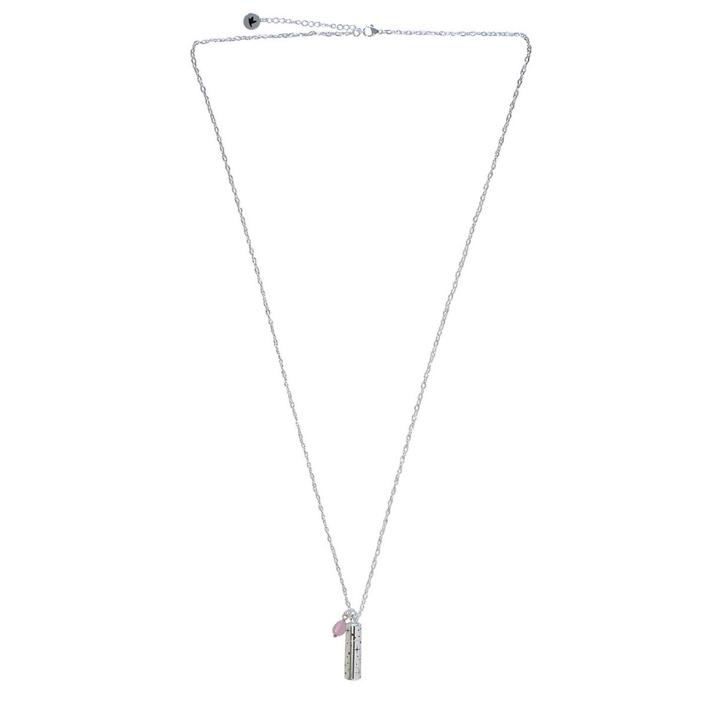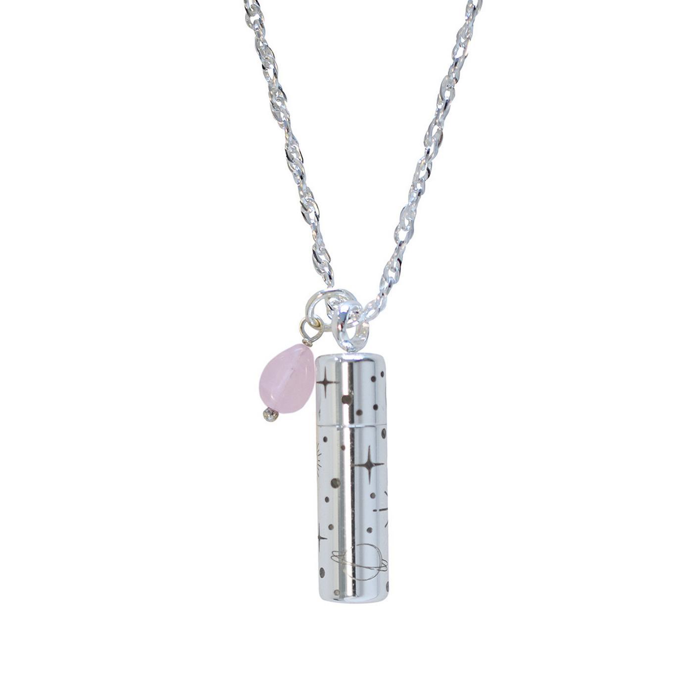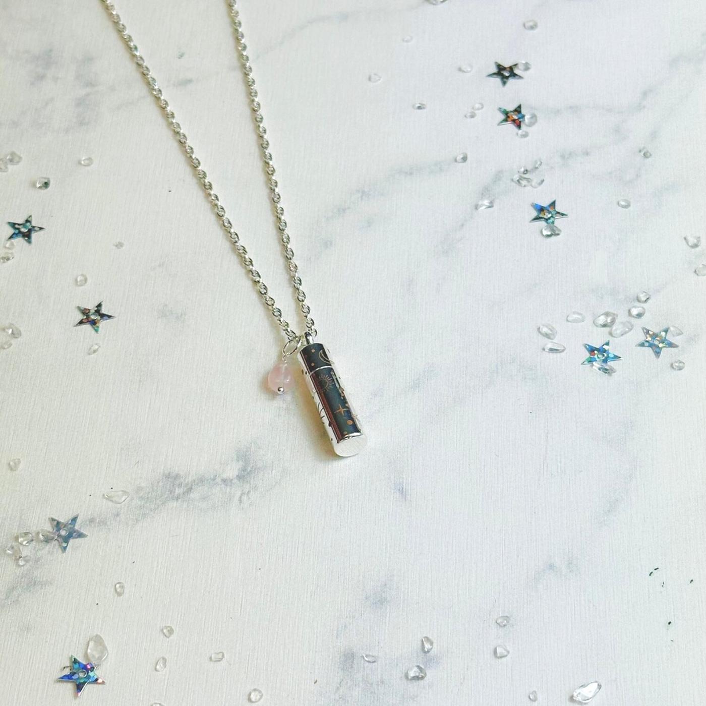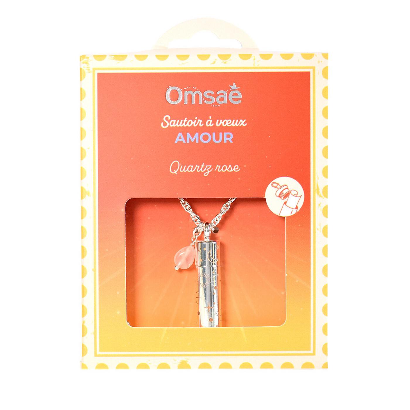 Sautoir à vœux Amour. Médaillon dévissable et chaîne ajustable 75-80 cm en acier inoxydable. Pierre naturelle de quartz rose origine Brésil. Papier roulé glissé à l'intérieur du médaillon.