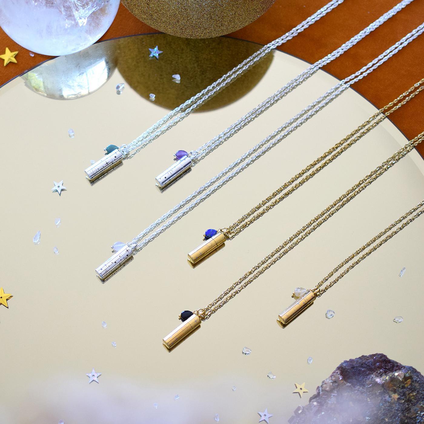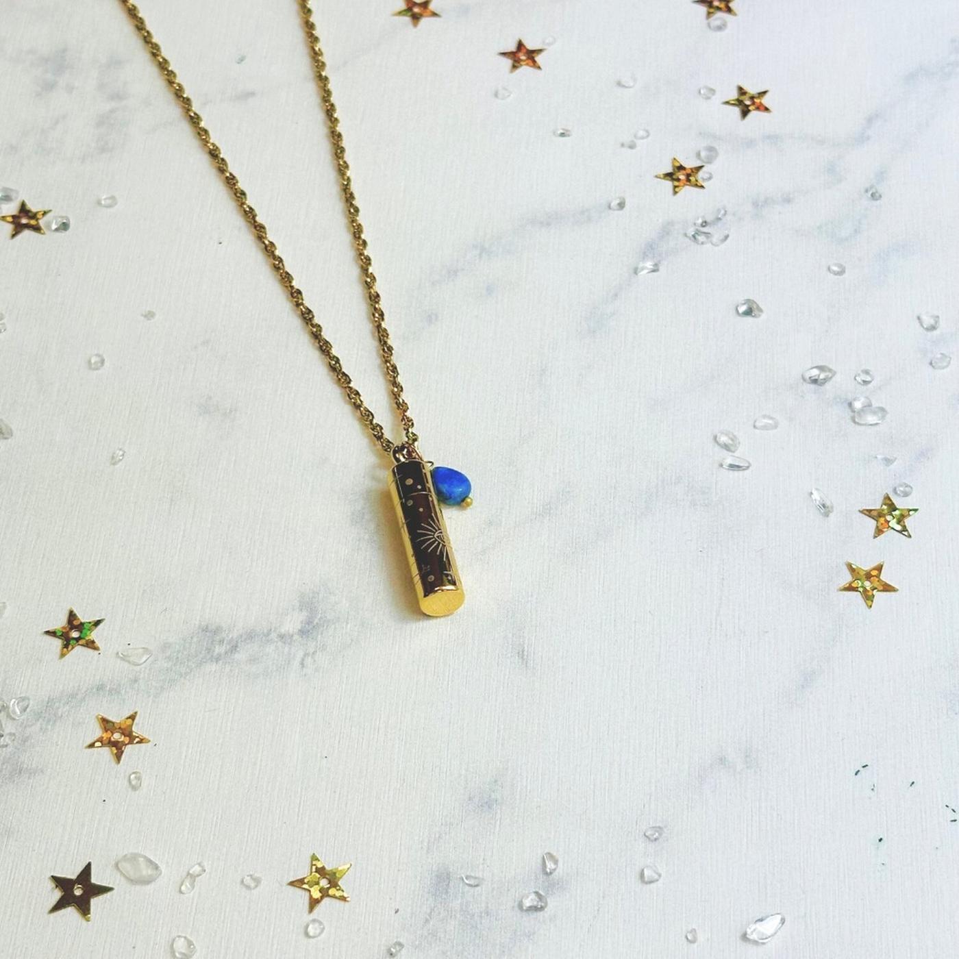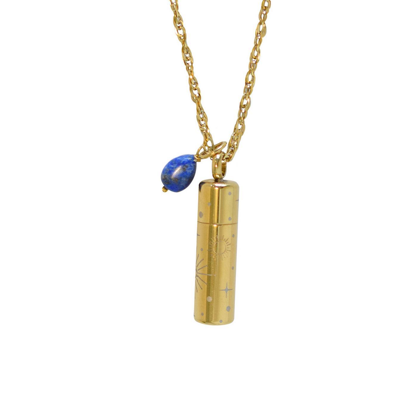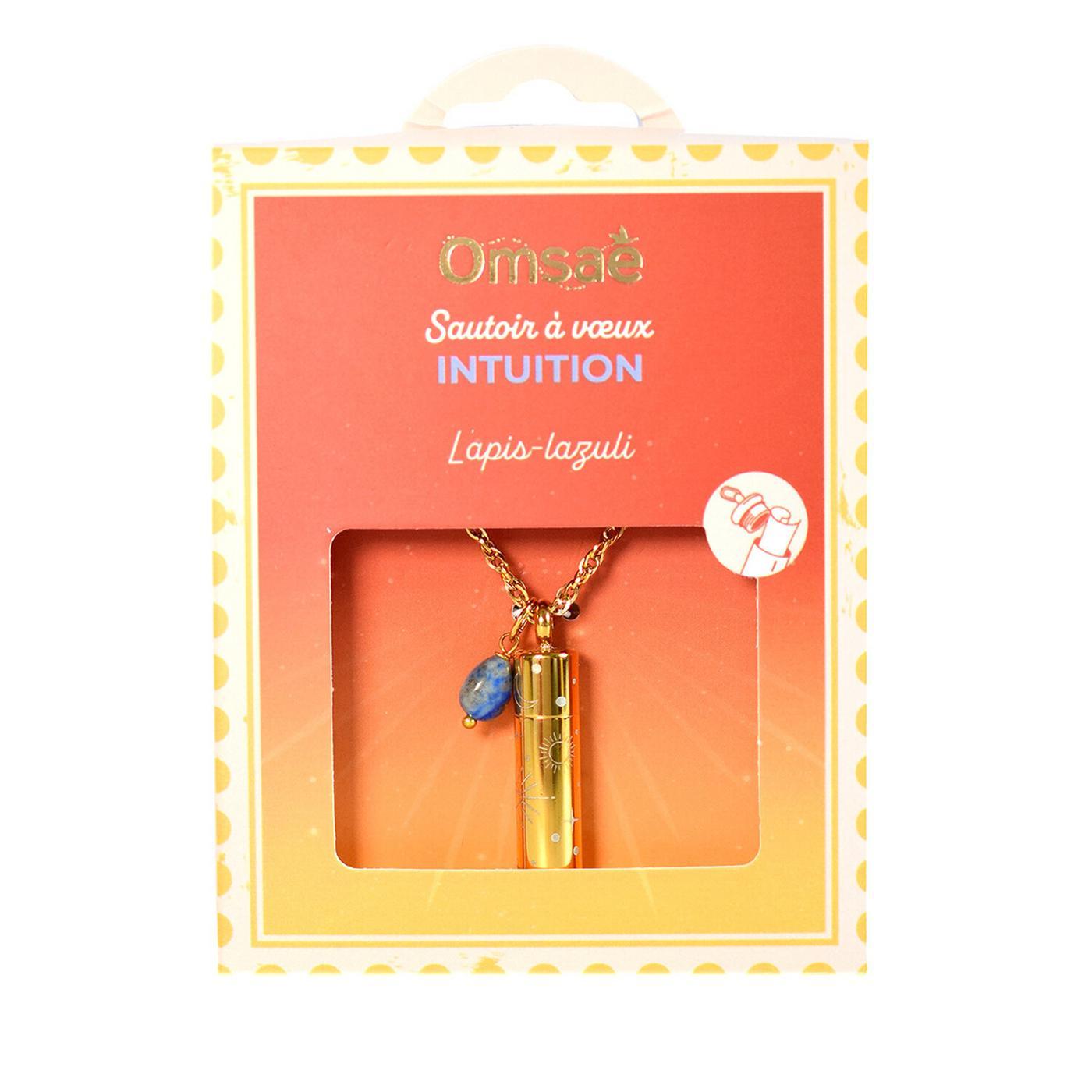 Sautoir à vœux Intuition. Médaillon dévissable et chaîne ajustable 75-80 cm en acier inoxydable. Pierre naturelle de lapis-lazuli origine Afghanistan. Papier roulé glissé à l'intérieur du médaillon.