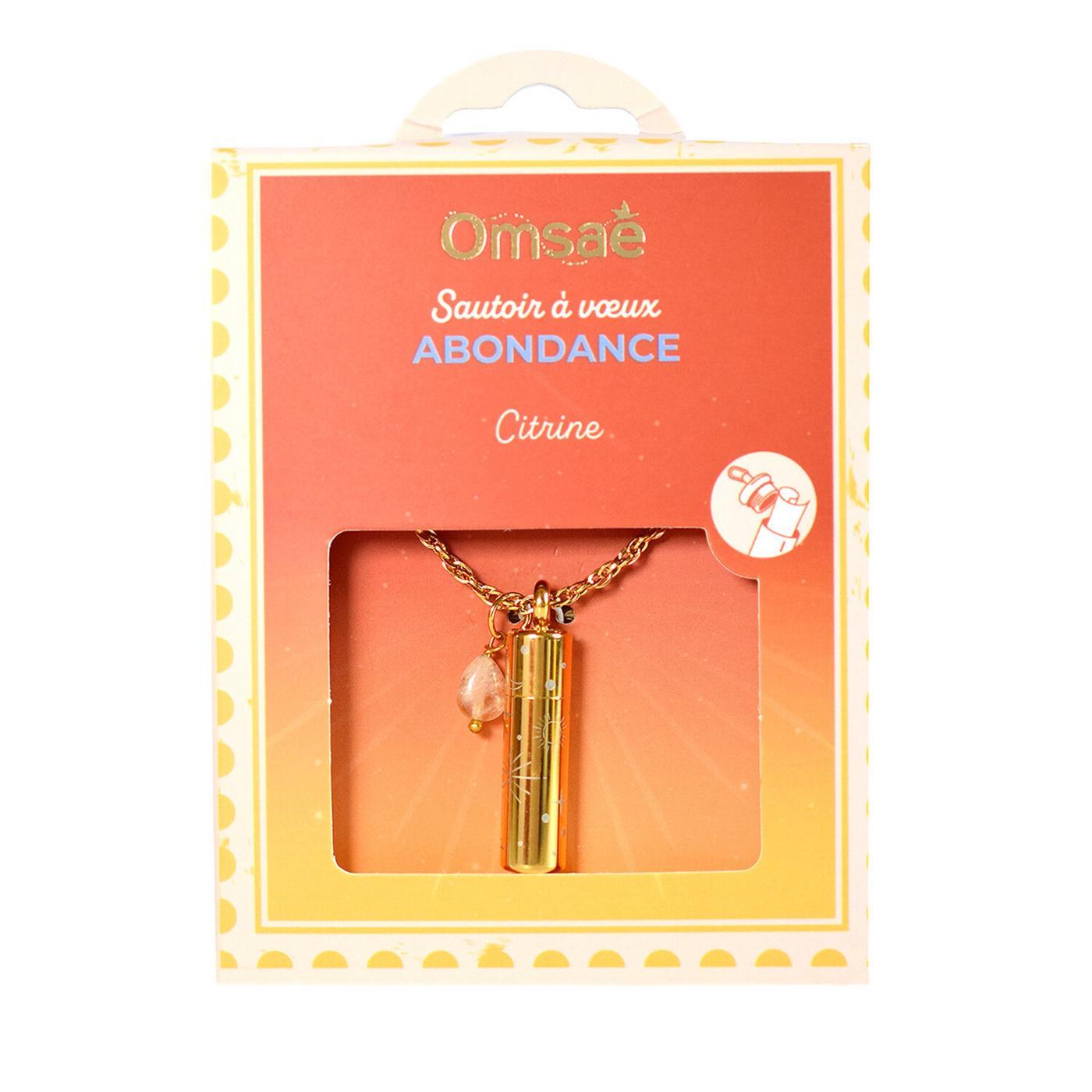 Sautoir à vœux Abondance. Médaillon dévissable et chaîne ajustable 75-80 cm en acier inoxydable. Pierre naturelle de citrine (améthyste chauffée) origine Brésil. Papier roulé glissé à l'intérieur du médaillon.