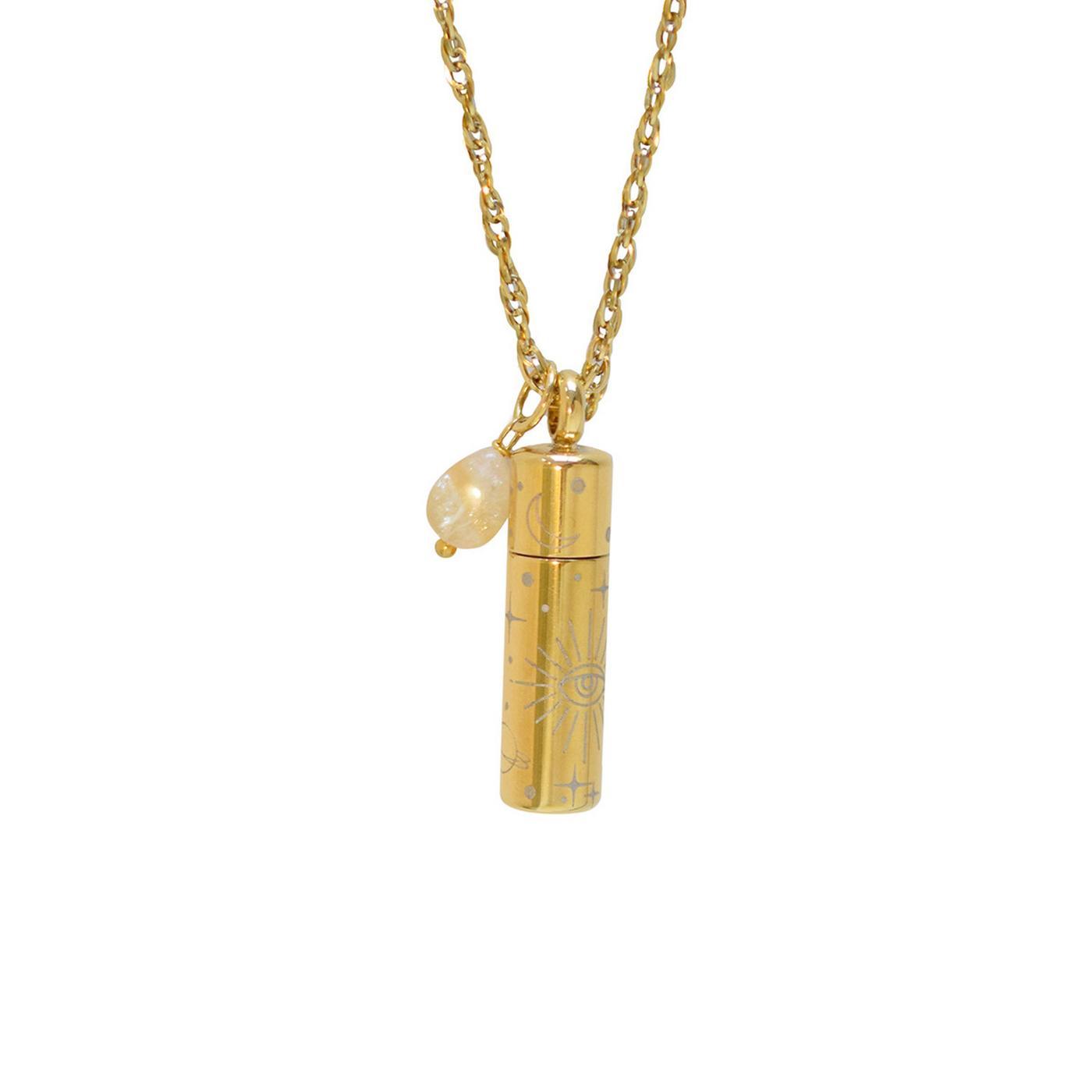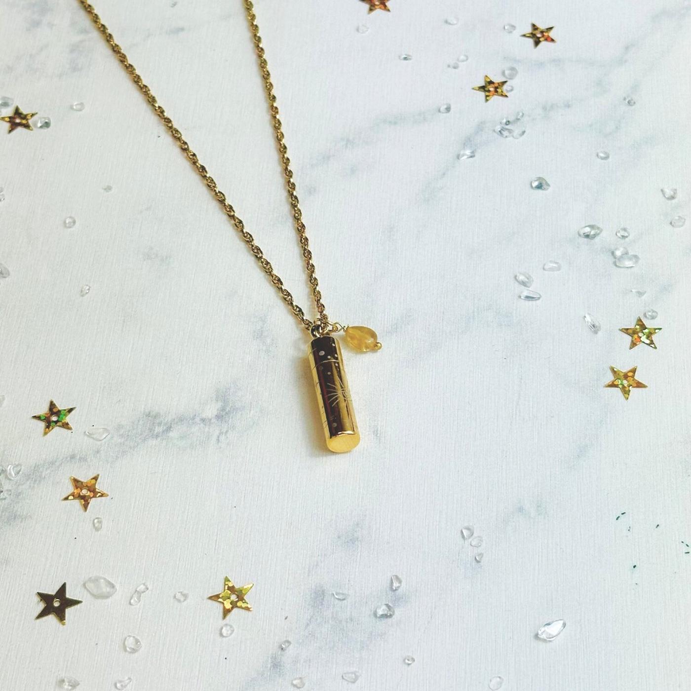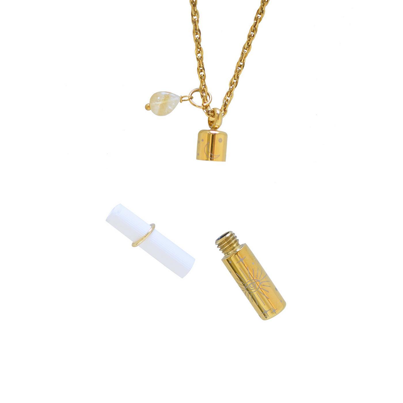 Glissez vos rêves les plus chers au creux de ce médaillon et laissez l’abondance éclore dans votre vie. Ce sautoir est un écrin secret où vos intentions prennent vie. La citrine, symbole de renouveau et d'épanouissement, diffuse une énergie lumineuse qui attire la prospérité et éveille la joie de vivre. Elle amplifiera votre intention et vous guidera vers des projets empreints de réussite. Portez ce bijou près de vous et confiez-lui vos souhaits. Chaque jour, il se chargera d’énergies positives pour accompagner leur réalisation.
