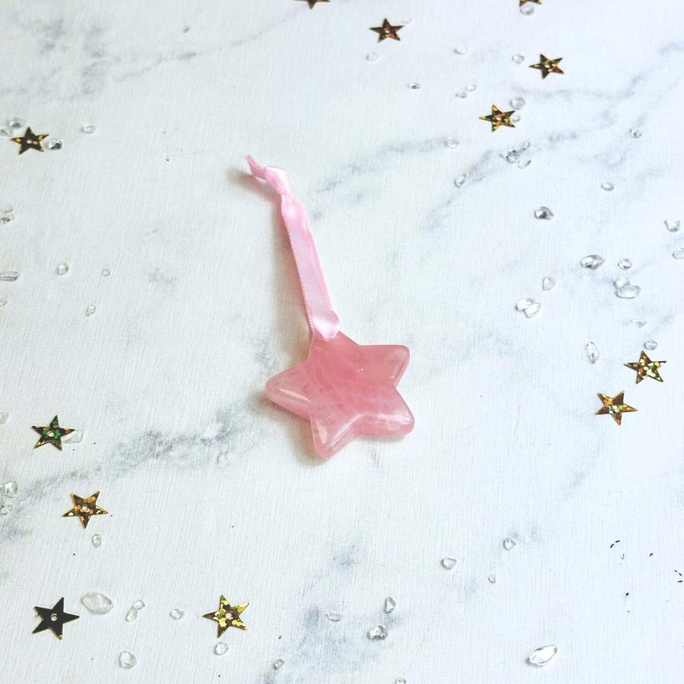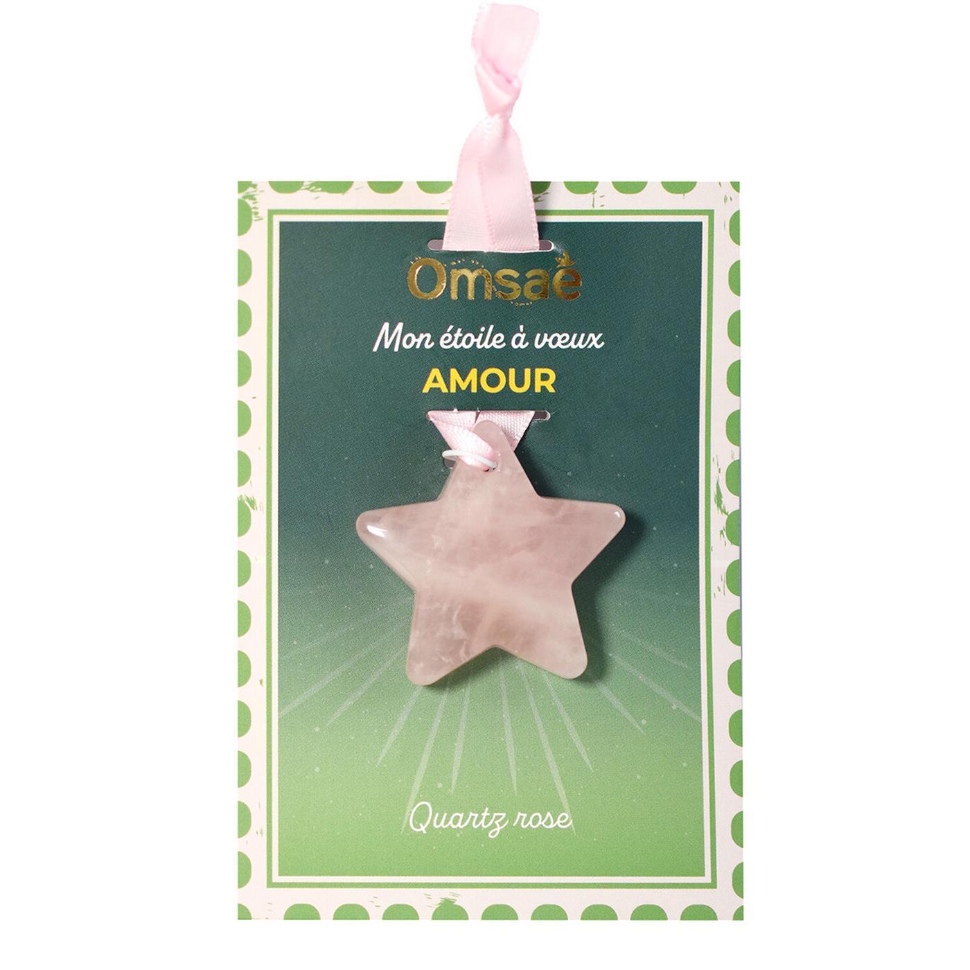 Étoile à vœux Amour. Pierre naturelle de quartz rose origine Brésil. Ruban coloré.