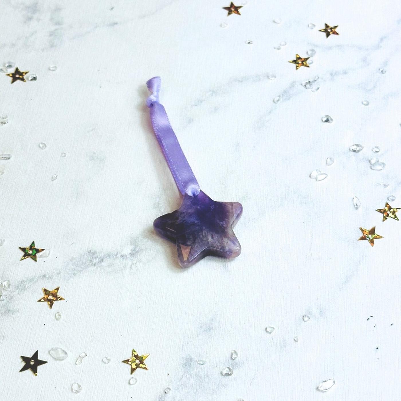 Étoile à vœux Calme. Pierre naturelle d'améthyste origine Brésil. Ruban coloré.