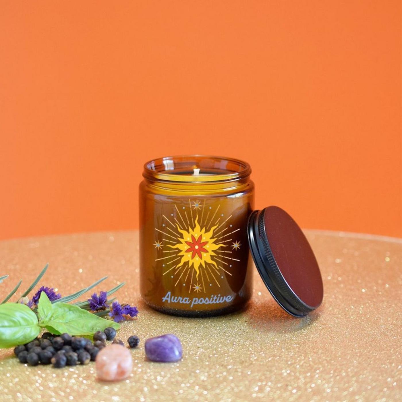 Bougie manifestation Aura positive 100 % cire végétale (cire de soja et cire de palme RSPO). Mèche en coton. Pierres naturelles de pierre de soleil et d'améthyste. Durée de combustion : env. 45 h. Poids net : 200 g. N° UFI : RA20-W0GD-Q00Q-055P. Contient : (R)-p-mentha-diene, citral, ethanone, octahydro, tetramethyl-naphthalenyl, linal acetate, benzyl salicylate, citronellol, linalool, dimethylpropionaldehyde, methyl-benzodioxole-priopionaldehyde, hexyl salicylate.