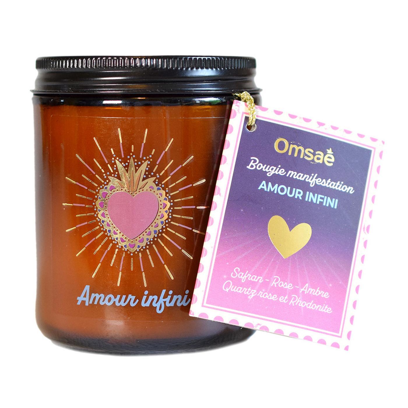 Bougie manifestation Amour infini 100 % cire végétale (cire de soja et cire de palme RSPO). Mèche en coton. Pierres naturelles de quartz rose et de rhodonite. Durée de combustion : env. 45 h. Poids net : 200 g. N° UFI : 5D20-E05T-1006-PGRR. Contient : methyl , dihydroxy, dimethylbenzoate, trimethyl-a-propylcyclohexanepropanol.