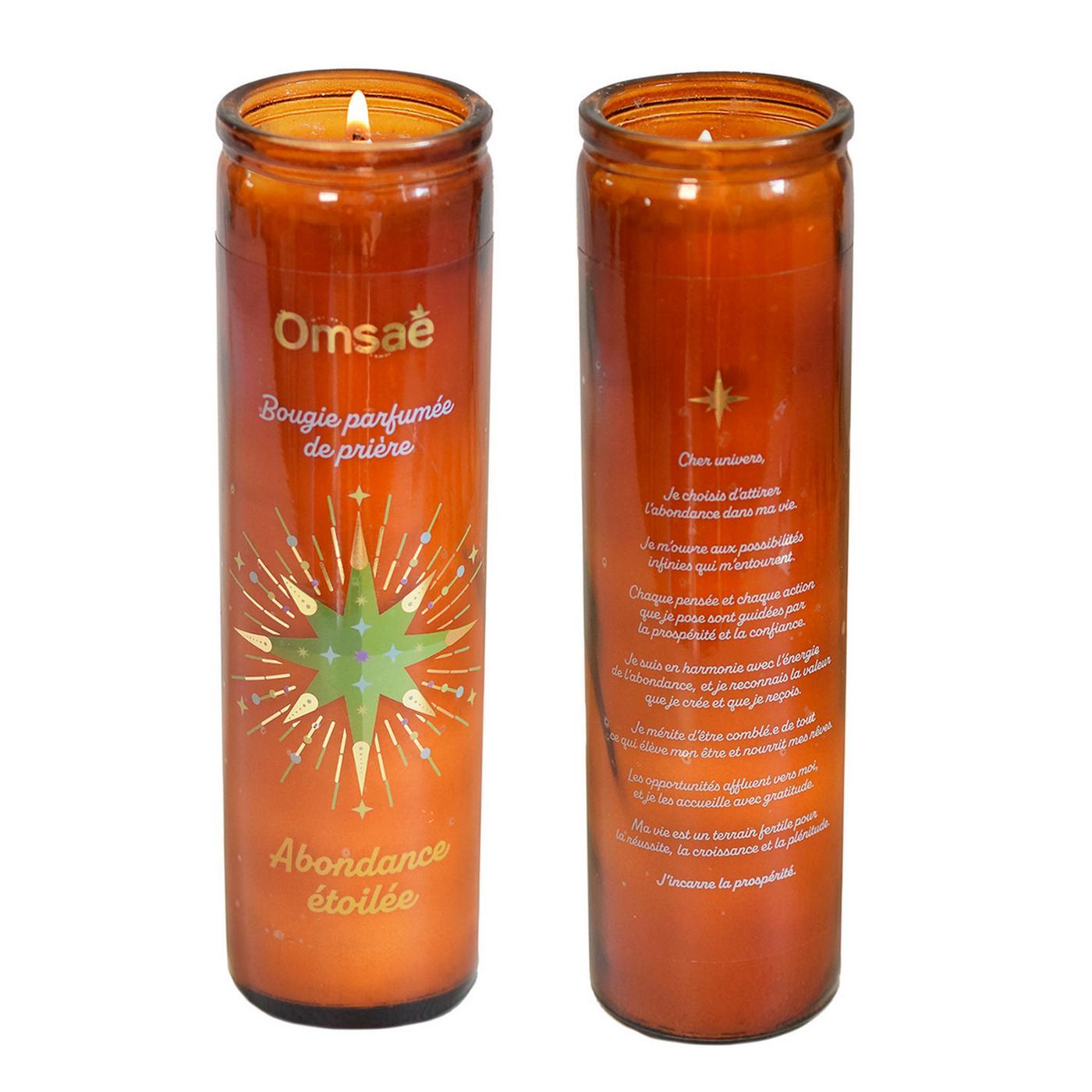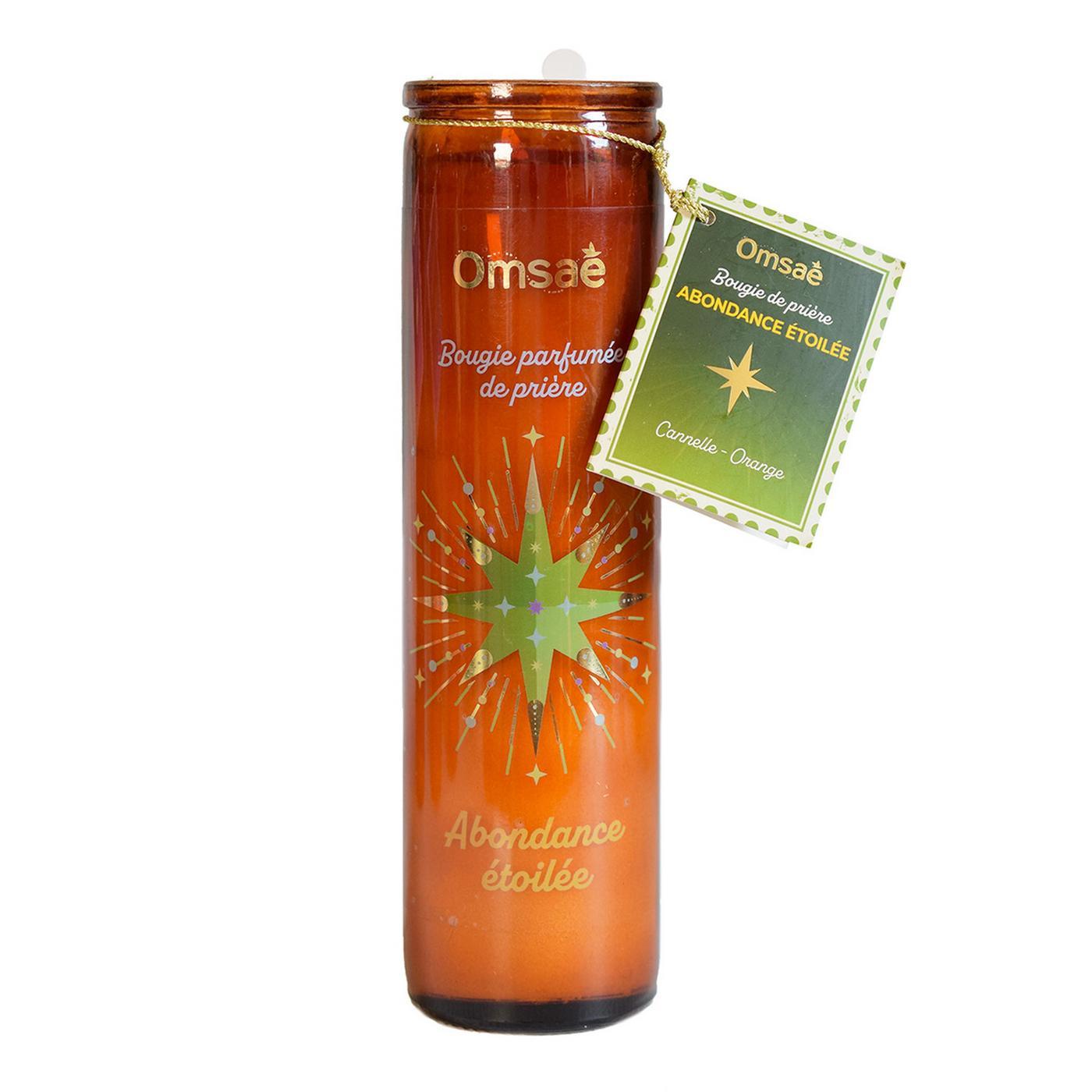 Bougie de prière Abondance étoilée 100% cire végétale (cire de soja et cire de palme RSPO). Mèche en coton. Durée de combustion env. 75 h. Poids net : 300 g. N° UFI : Q420-W03M-300Q-PG0J. Contient : (R)-p-mentha-diene, cinnamaldehyde, coumarin, cinnamyl alcohol, eugenol, isoeugenol.