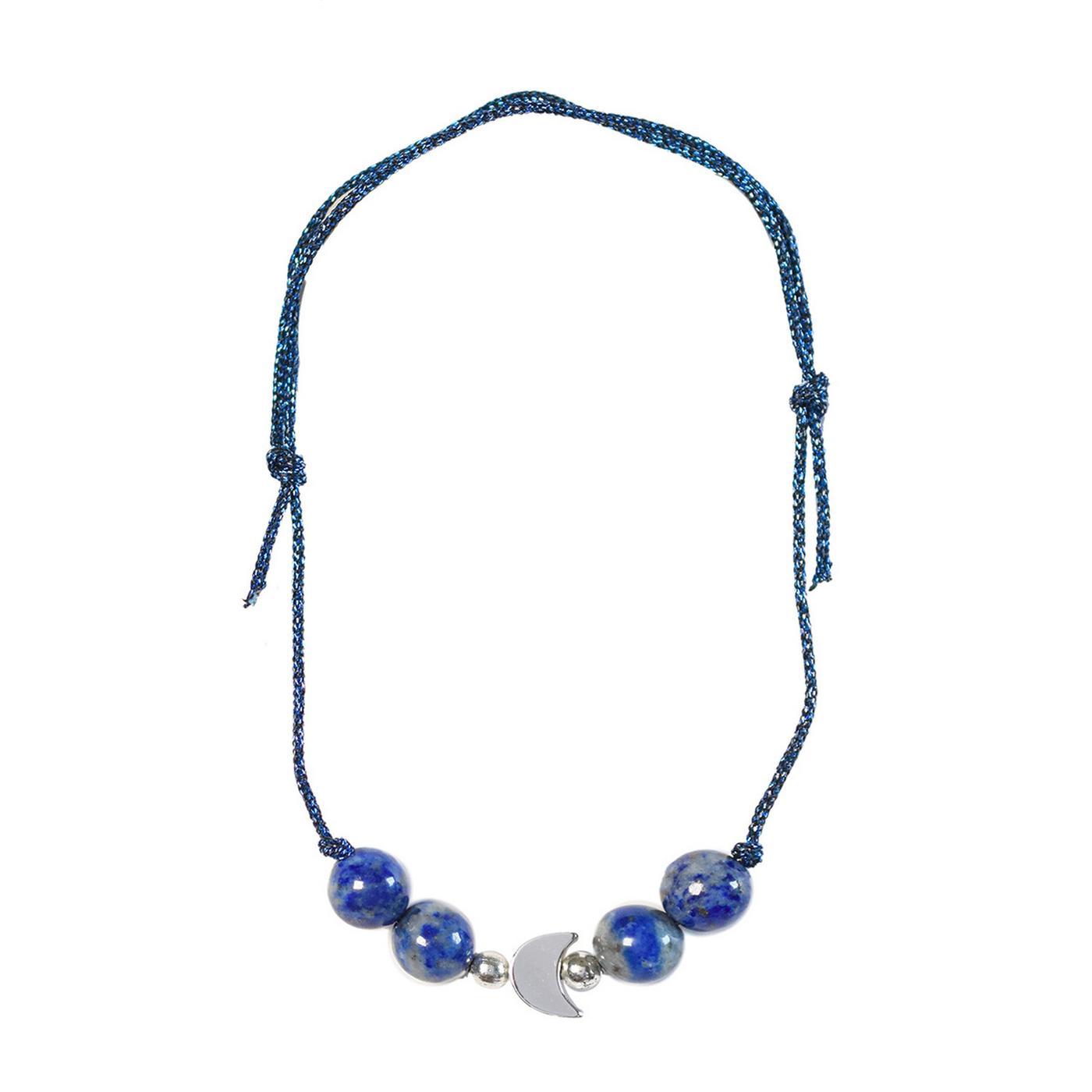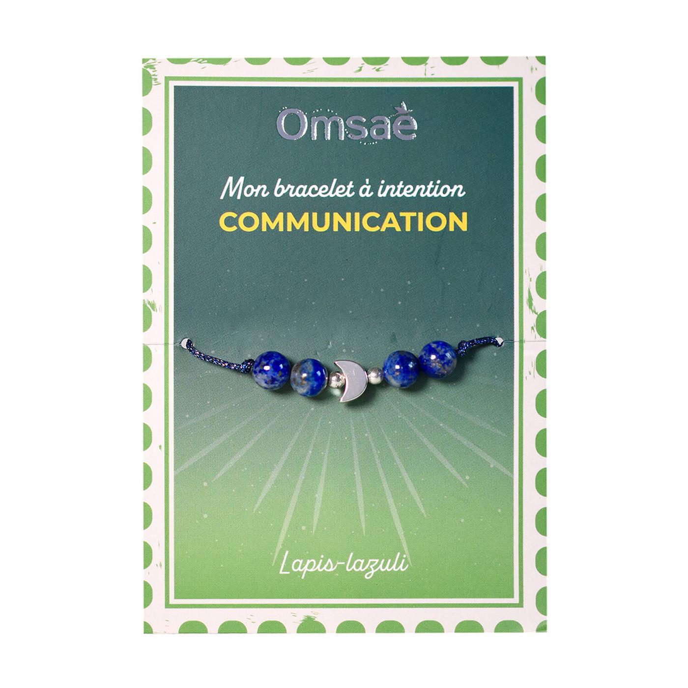Bracelet à intention Communication. Pierre naturelle de lapis-lazuli origine Afghanistan, charm et séparateurs en acier inoxydable. Cordon en polyester. Taille ajustable. Adapté aux poignets fins.