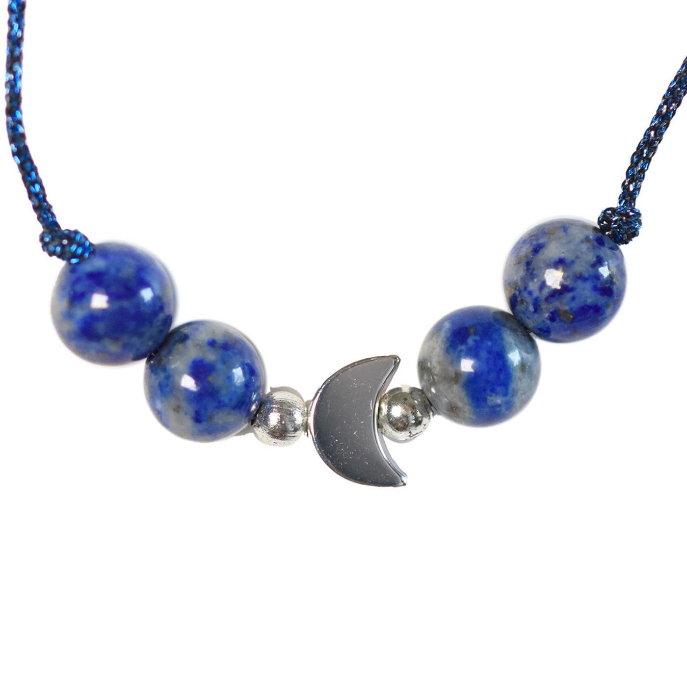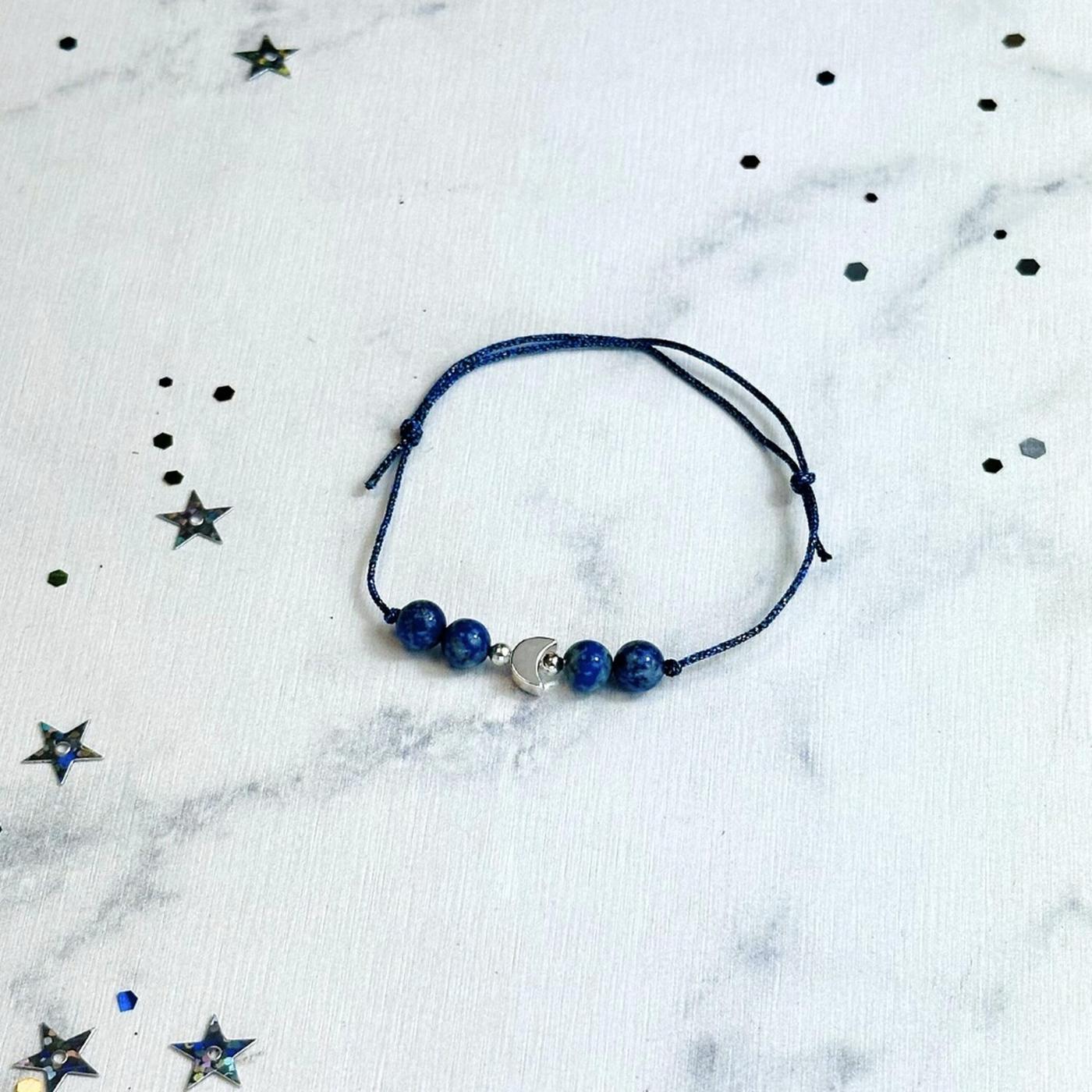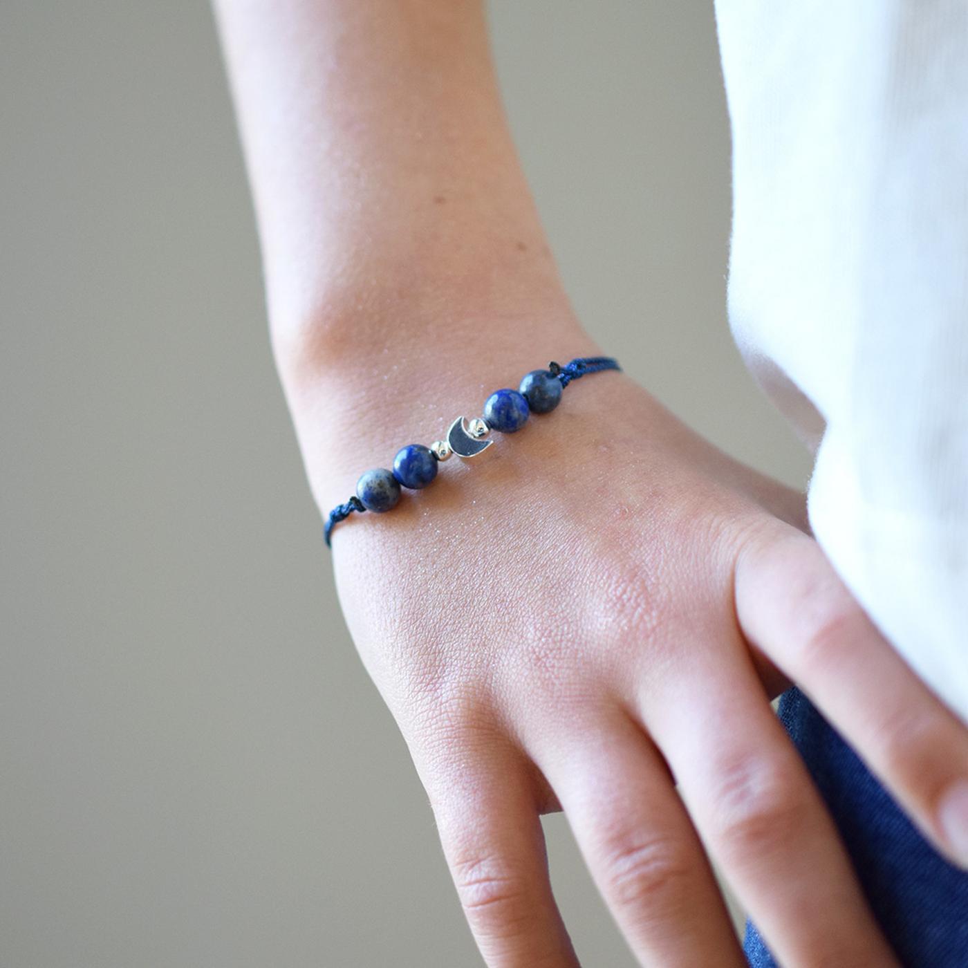 Affronte chaque défi avec ouverture et bienveillance ! Ce bracelet est là pour te rappeler que tu as le droit de t'exprimer. Le lapis-lazuli, pierre du dialogue, ouvre ton esprit et t'aide à rester concentré. La lune, symbole de réfléxion et de compréhension, t’encourage à écouter ton intuition et à partager tes idées sans peur. Porte ton bracelet chaque jour comme un talisman. Quand tu le regardes, souviens-toi que tout est possible dès que tu communiques avec confiance !