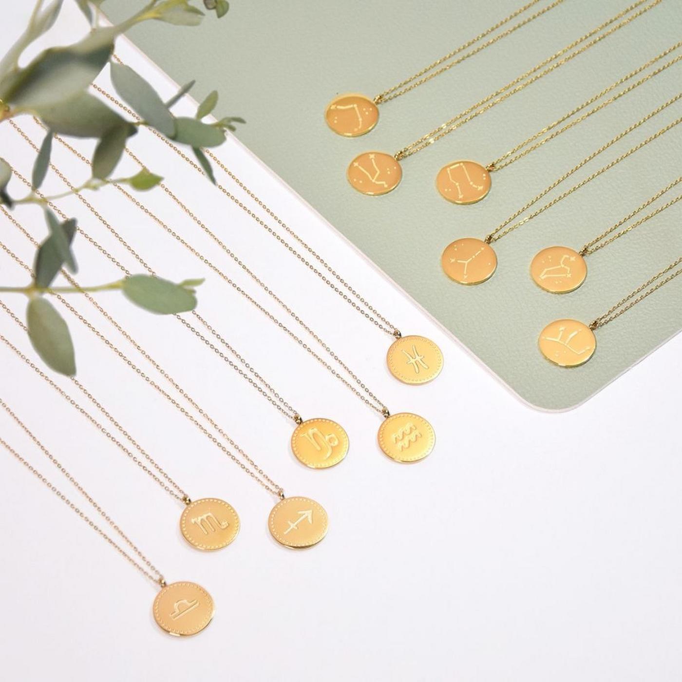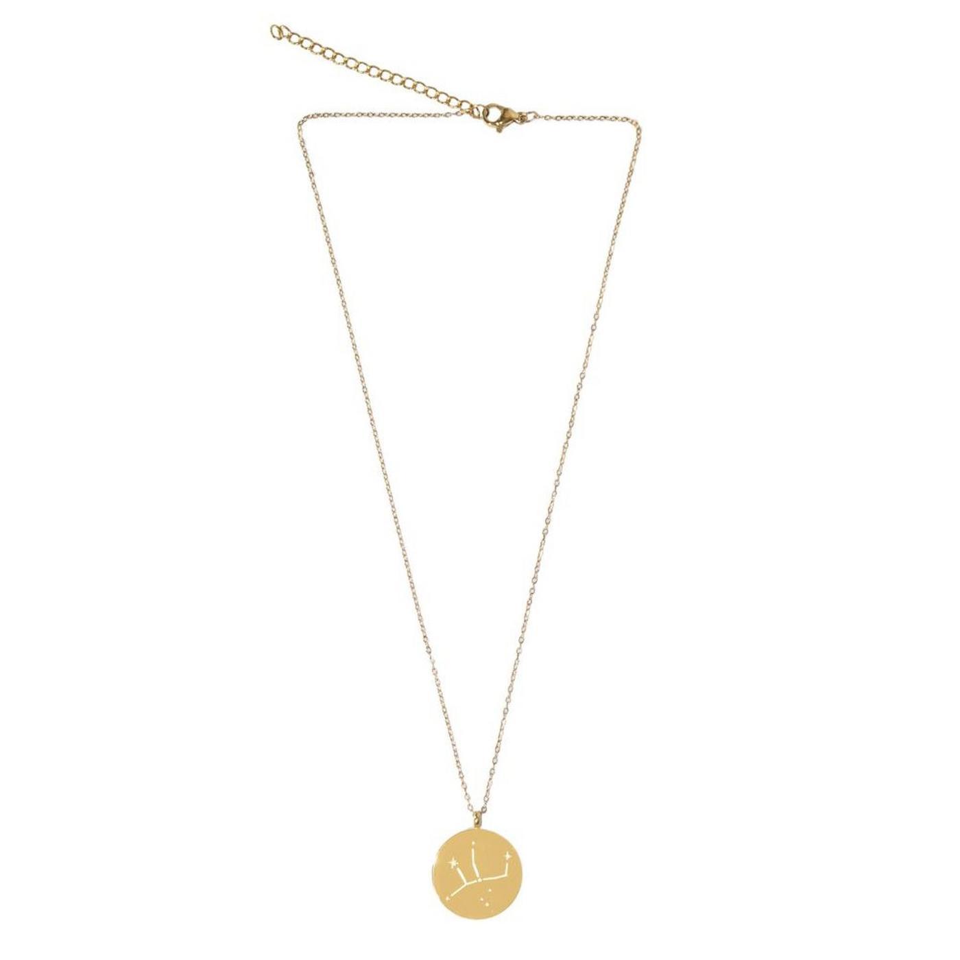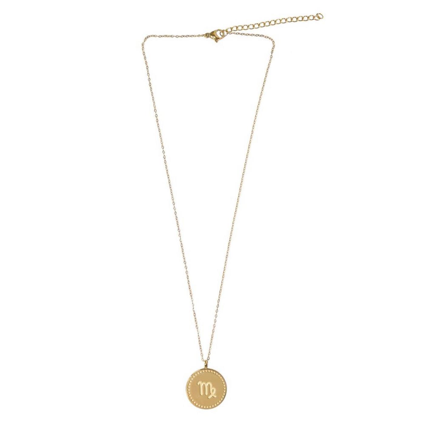 Collier composé d'une médaille gravée et d'une chaîne en acier inoxydable. Médaille gravée au recto et au verso avec le signe et la constellation Vierge. Chaîne ajustable d'une longueur de 40-45 cm.