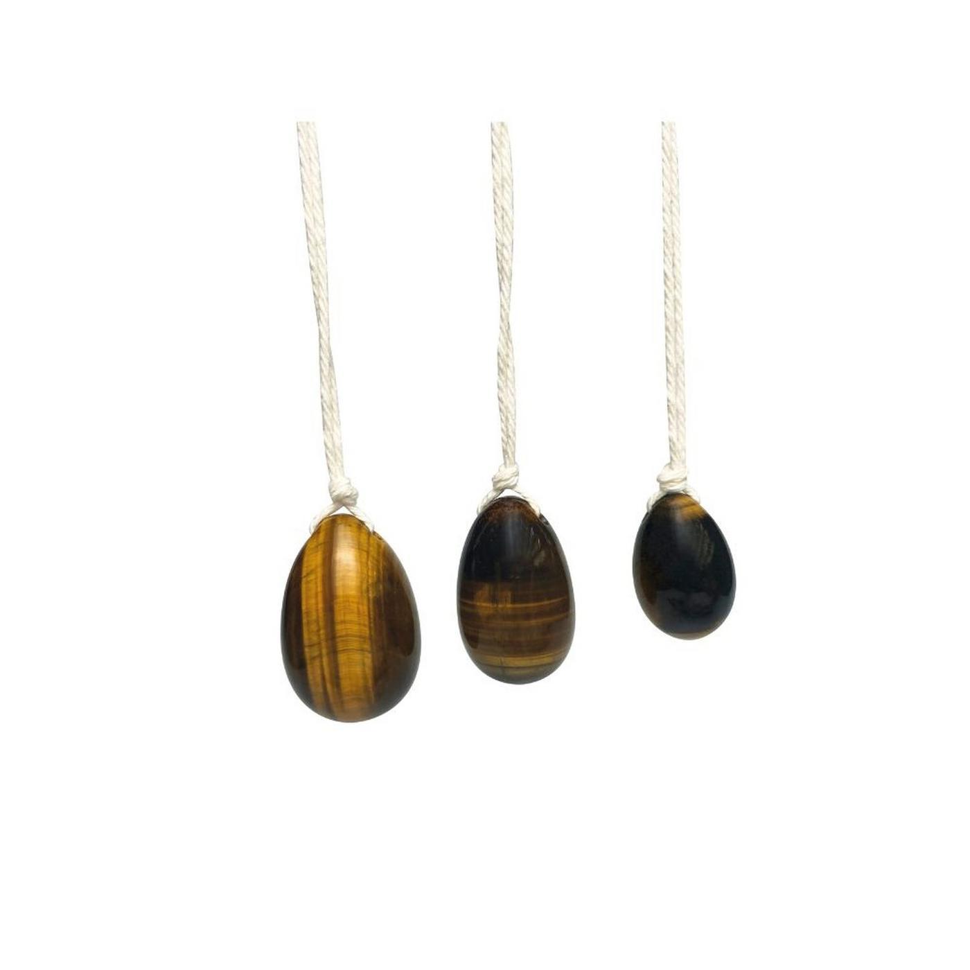 3 oeufs de Yoni en pierre naturelle d'œil de tigre. Cordons en coton naturel d'environ 40 cm. Dimensions et poids des oeufs : Grand : 4,2 x 2,8 cm. 60 g. Moyen : 3,8 x 2,4 cm. 40 g. Petit : 3 x 2 cm. 20 g.
