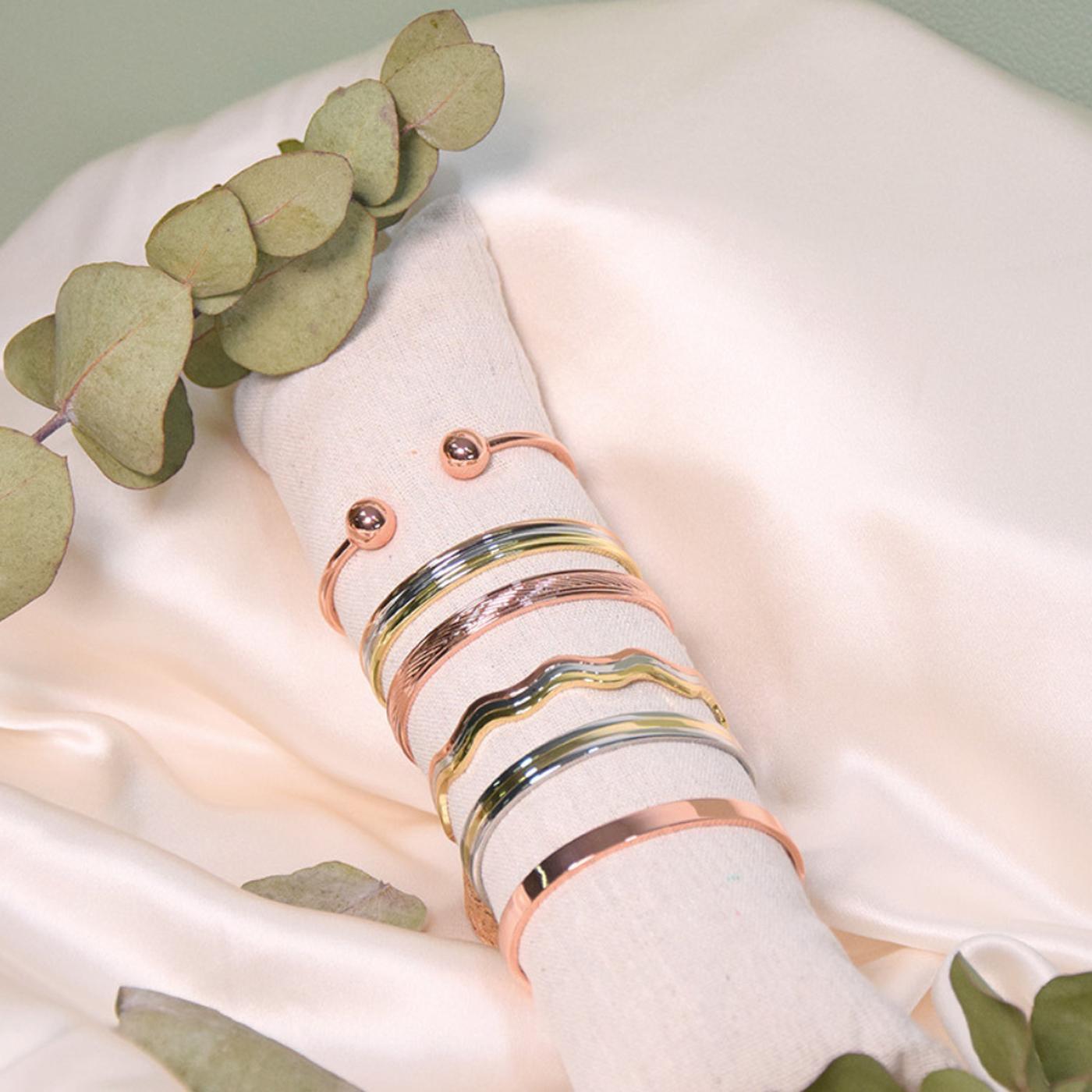 Bracelet composé de laiton (cuivre et zinc), placage cuivre et de deux aimants. Largeur du bracelet : 0,3 cm.