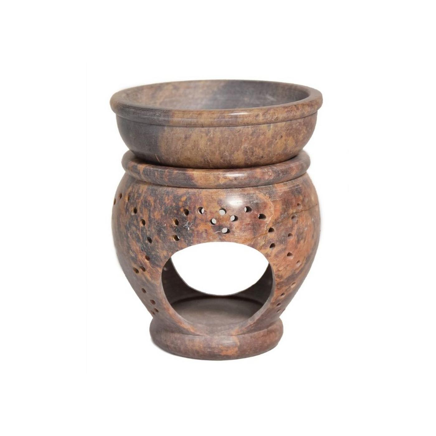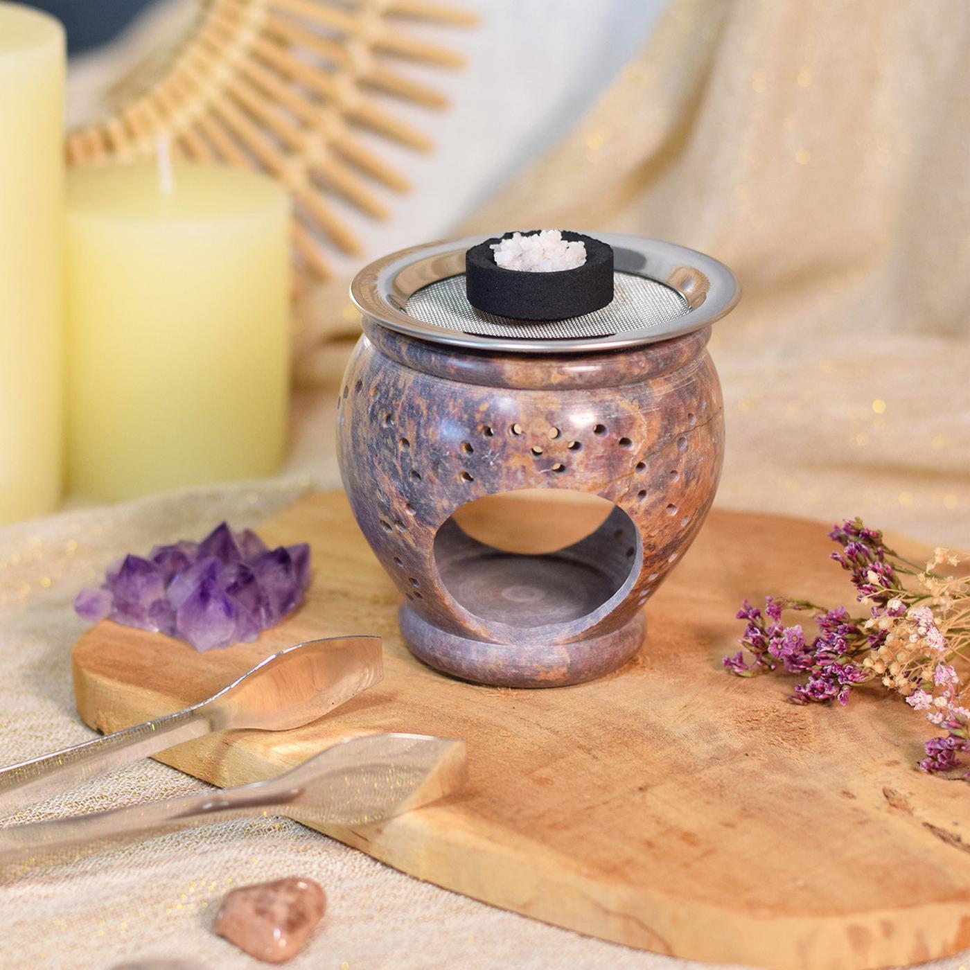 Brûle-encens et coupelle en stéatite naturelle. Grille en acier inoxydable. Dimensions approximatives : 8 x 8 cm.