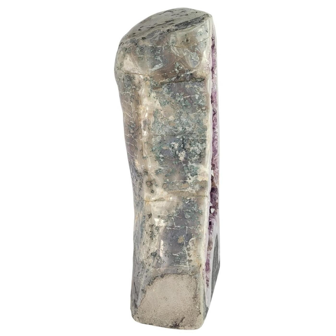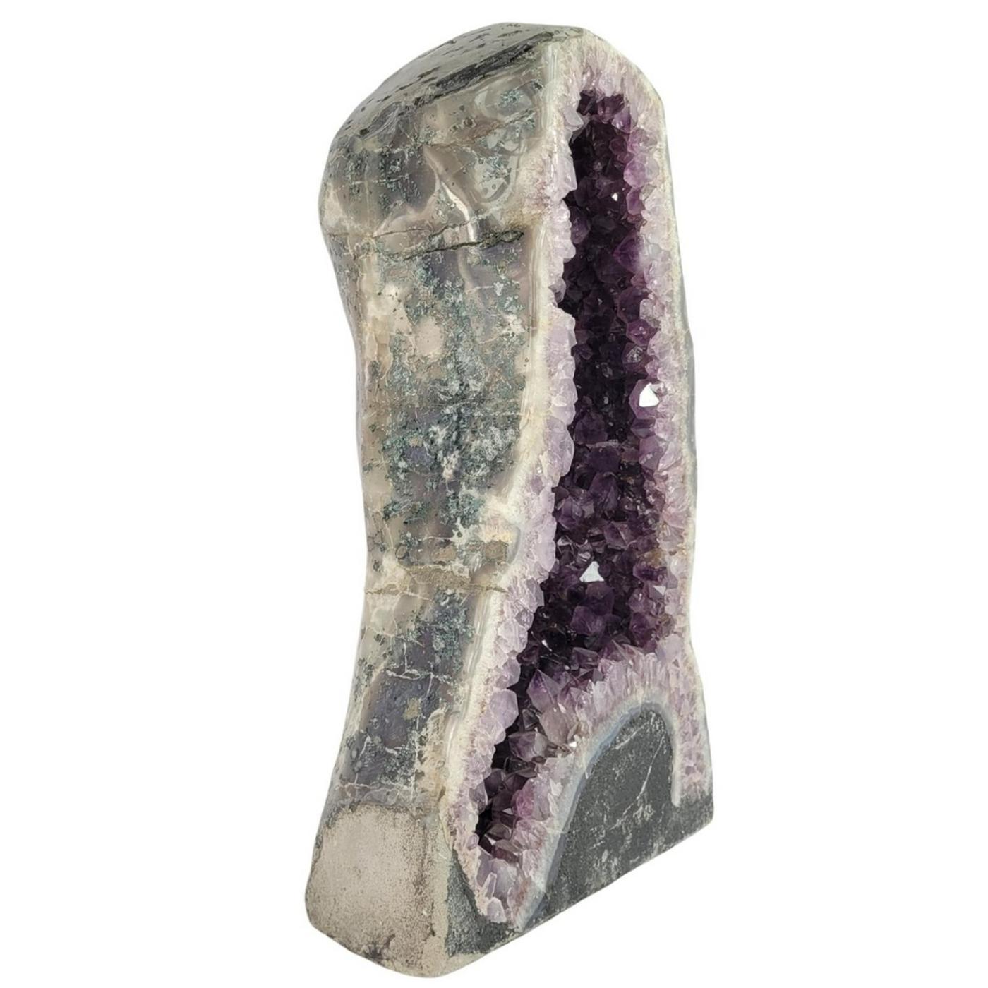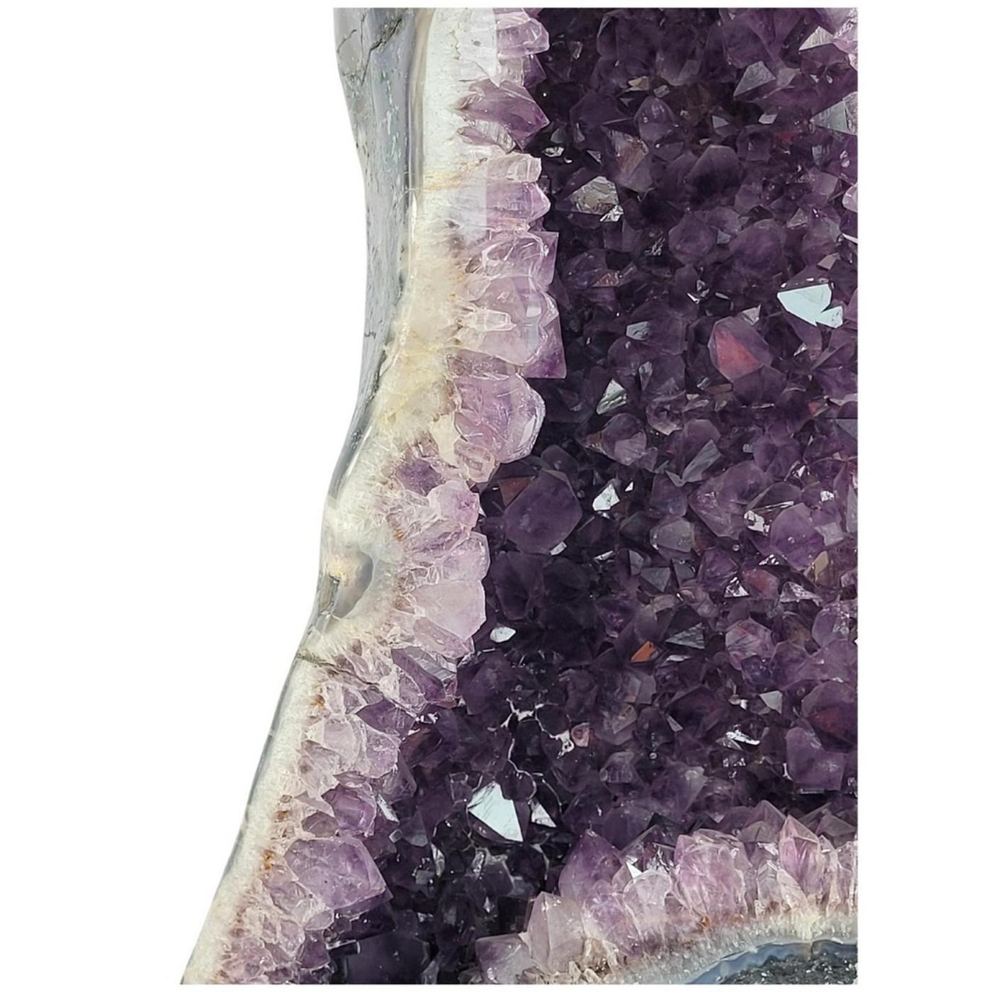 Géode d'améthyste polie sans revêtement. Pierre naturelle. Poids : 34 kg. Origine : Brésil. Largeur : 35 cm. Hauteur : 57 cm. Pièce unique.