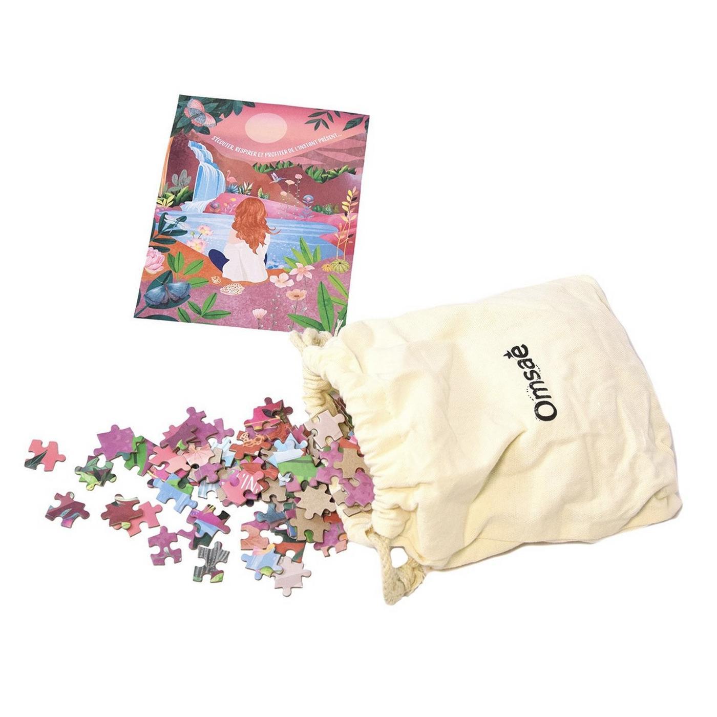 Puzzle de méditation 500 pièces. Dimensions : 38 x 52 cm. Pochon en coton. Affiche fournie : 21 x 15.3 cm (fini mat). Illustration originale Omsaé.