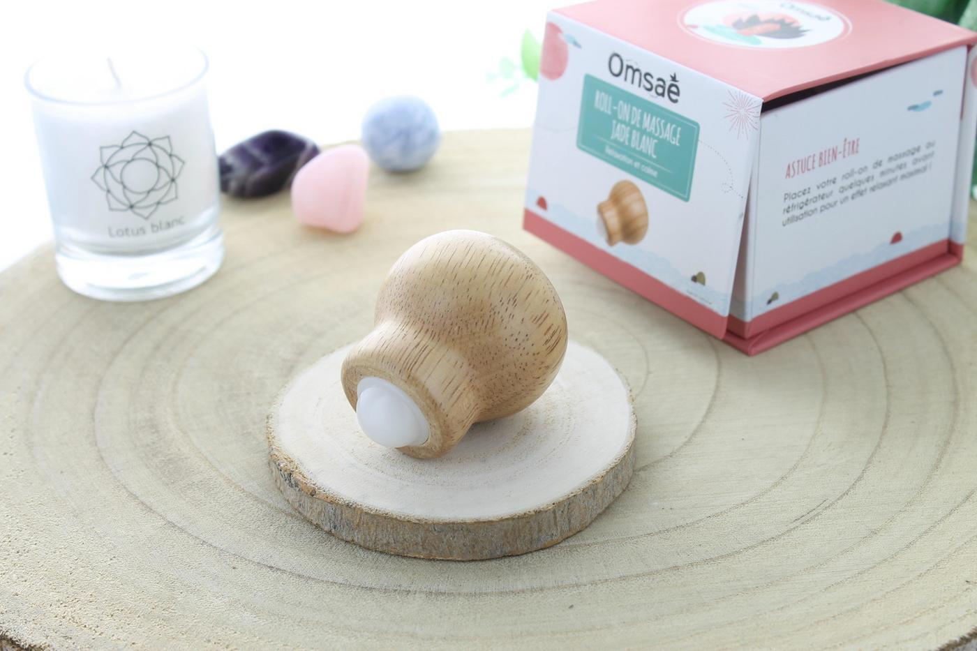 Roll-on pour massage en bois et pierre naturelle. En roulant sur le visage ou sur le corps, la bille assure un massage doux et permet d'améliorer l'apparence de la peau. Le jade blanc, sélectionné pour sa faculté à calmer, vient renforcer les bienfaits du massage. Caractéristiques : Roll-on en bois d'hévéa de Malaisie. Bille en pierre naturelle. Dimensions 6 x 4,5 cm. Conseils d'utilisation : Appliquer sur la zone à masser quelques gouttes d'huile ou de crème. Faire glisser le roll-on de massage sur le visage ou sur le corps. Après utilisation, rincer le roll-on à l'eau claire et au savon. Placer le roll-on au réfrigérateur quelques minutes avant utilisation pour un effet relaxant maximal.