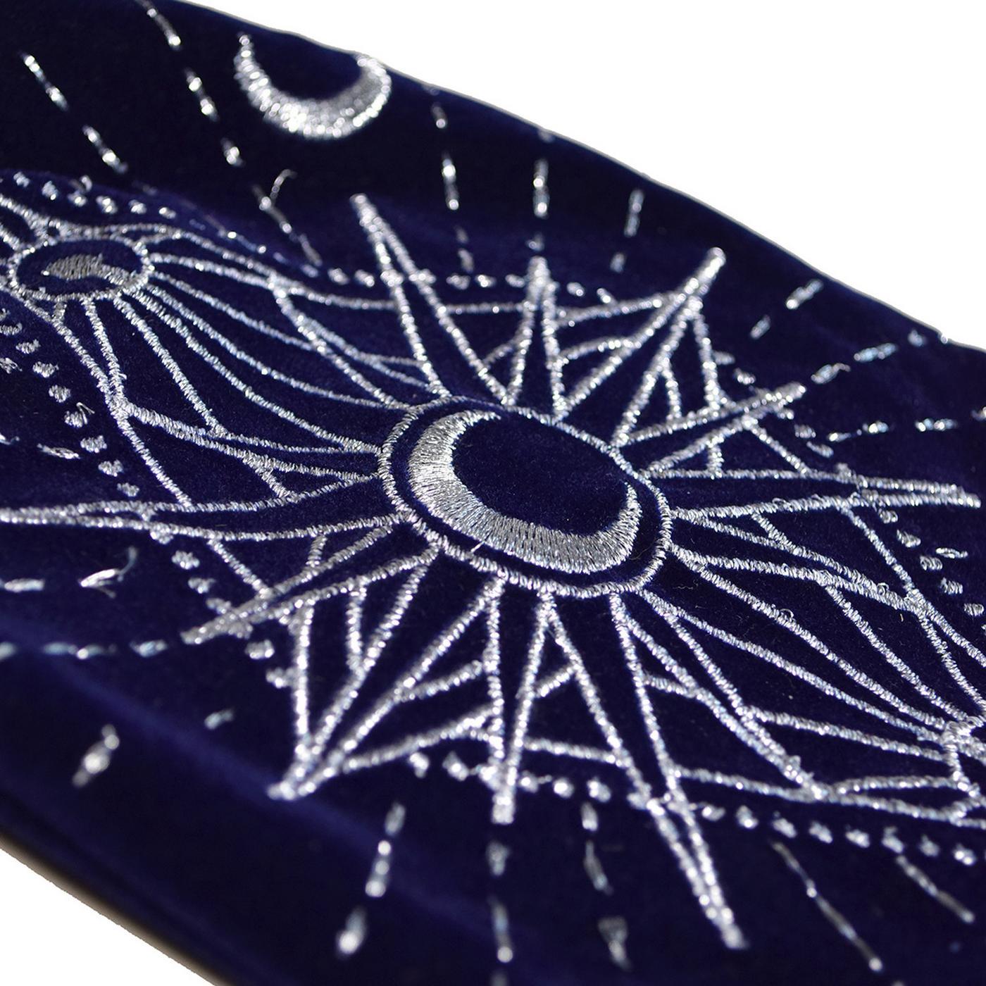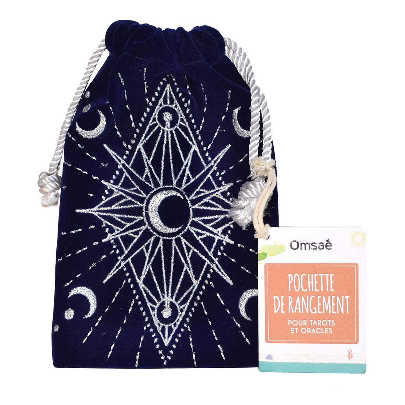 Cette bourse en velours brodée permet de ranger et de protéger ses cartes d'oracles ou de tarots. Fermée par un cordon, il est désormais possible de transporter son jeu de cartes partout avec soi dans un accessoire élégant et inspirant. Ainsi il sera possible de réaliser ses tirages n'importe où, dès que le besoin s'en fera ressentir. Les broderies argentées puisent leur inspiration dans les différentes phases de la Lune et dans les énergies créatrices de cet astre magique.