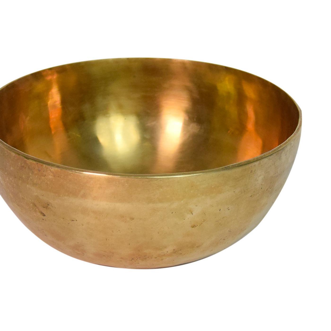 Bol chantant, fabrication artisanale à la main. Composition : cuivre et étain, diamètre env. 20 cm. Bâton en bois d'acacia et support en feutrine. Fabriqué à la main en Inde.