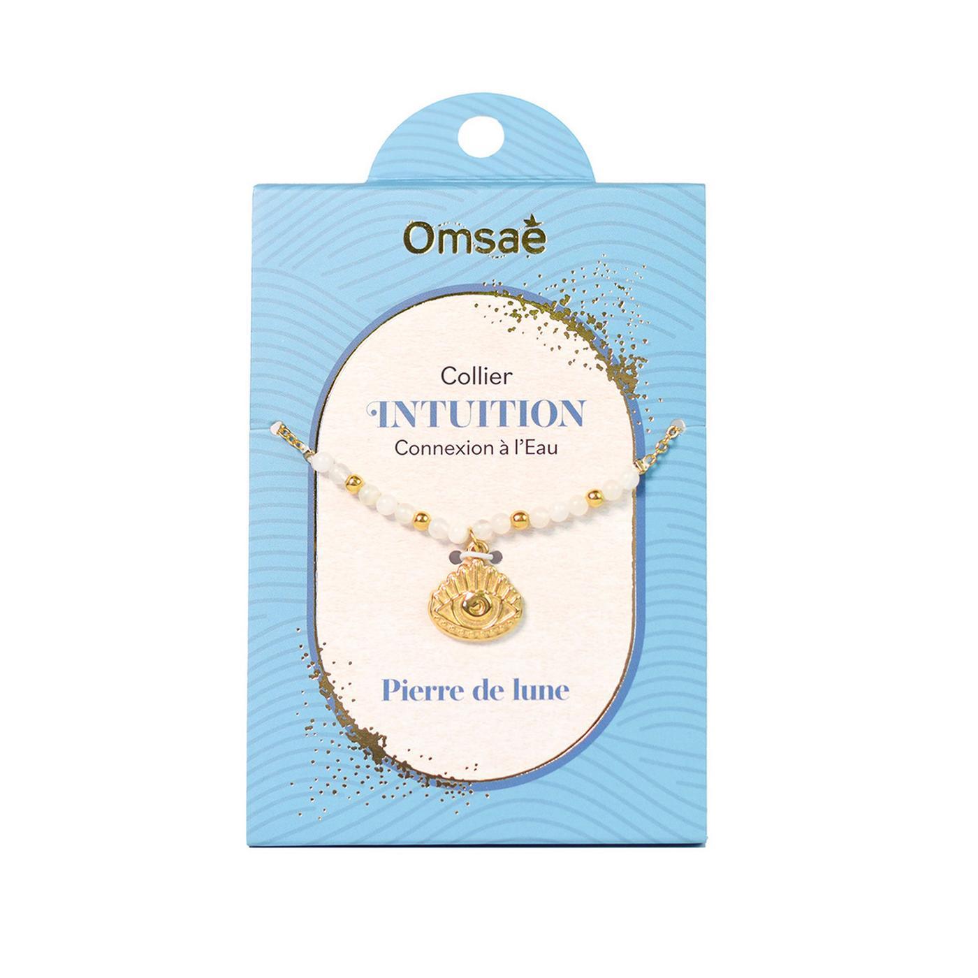 Collier connexion aux éléments : Intuition. Pierre naturelle de pierre de lune origine Inde. Collier composé d’une chaine en acier inoxydable dorée avec des perles de 3 mm en pierre naturelle, des perles en acier inoxydable doré et un pendentif 3D en acier inoxydable doré. Longueur collier : environ 50 cm.