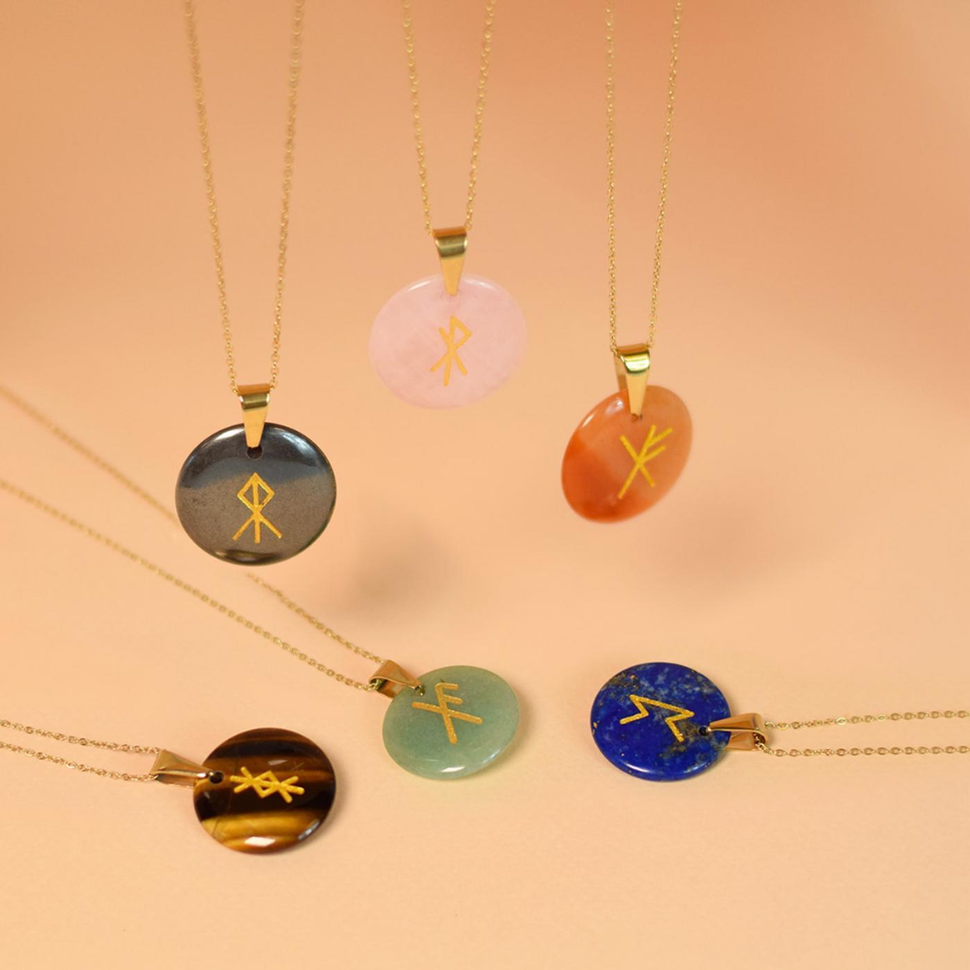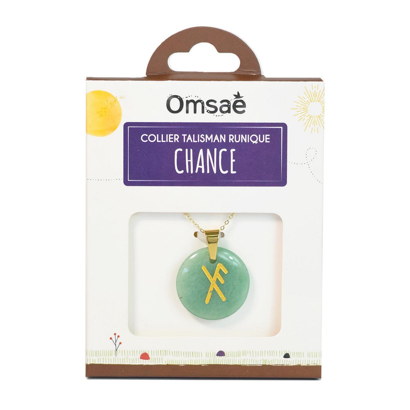 Collier composé d'un pendentif en pierre naturelle d'aventurine verte gravé de la rune liée Chance et d'une chaine en acier inoxydable. La combinaison des runes nordiques ancestrales Gebo (don) et Ansuz (bonne fortune) représente la rune liée Don de Chance. L'aventurine verte, pierre de chance et d'apaisement permet de renforcer les effets de ce talisman à porter sur soi pour bénéficier de ses vertus.