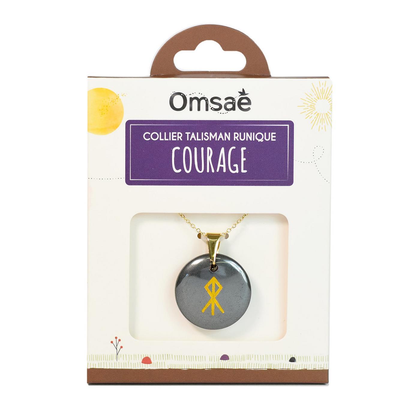 Collier composé d'un pendentif en pierre naturelle d'hématite gravé de la rune liée Courage et d'une chaine en acier inoxydable. La combinaison des runes nordiques ancestrales Gebo (Don) et Tiwaz (courage), représente la rune liée Don de Courage. L'hématite, pierre de courage, développe la confiance en soi et permet de renforcer les effets de ce talisman à porter sur soi pour bénéficier de ses vertus.
